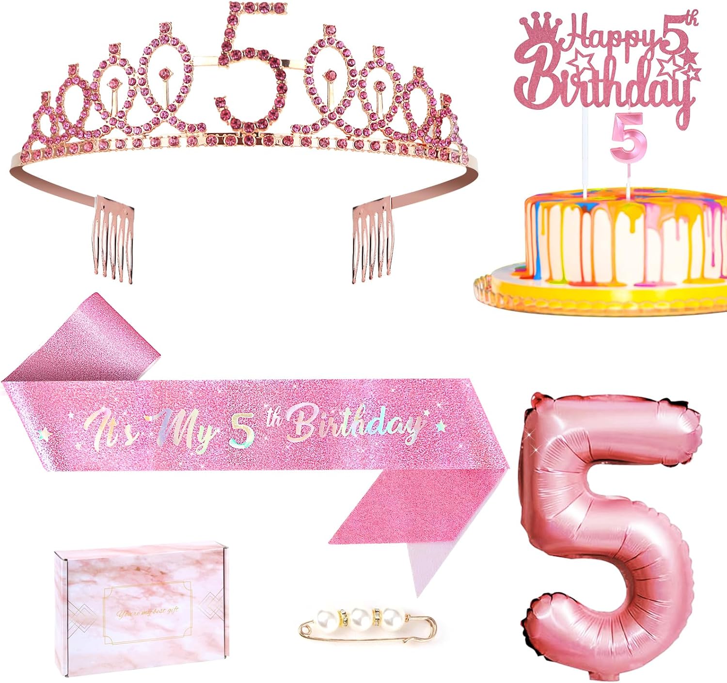 5th Birthday Decorations Girl Kit:You will get glittery 5th birthday crown tiara *1pc, “It’s my 5th birthday” sash *1pc,Happy 5th Birthday Cake Topper *1pc, number candle 5 *1pc, 32in Number 5 foil balloon *1pc, pearl pin*1pc ,these princess birthday party decorations come in a cute gift box.