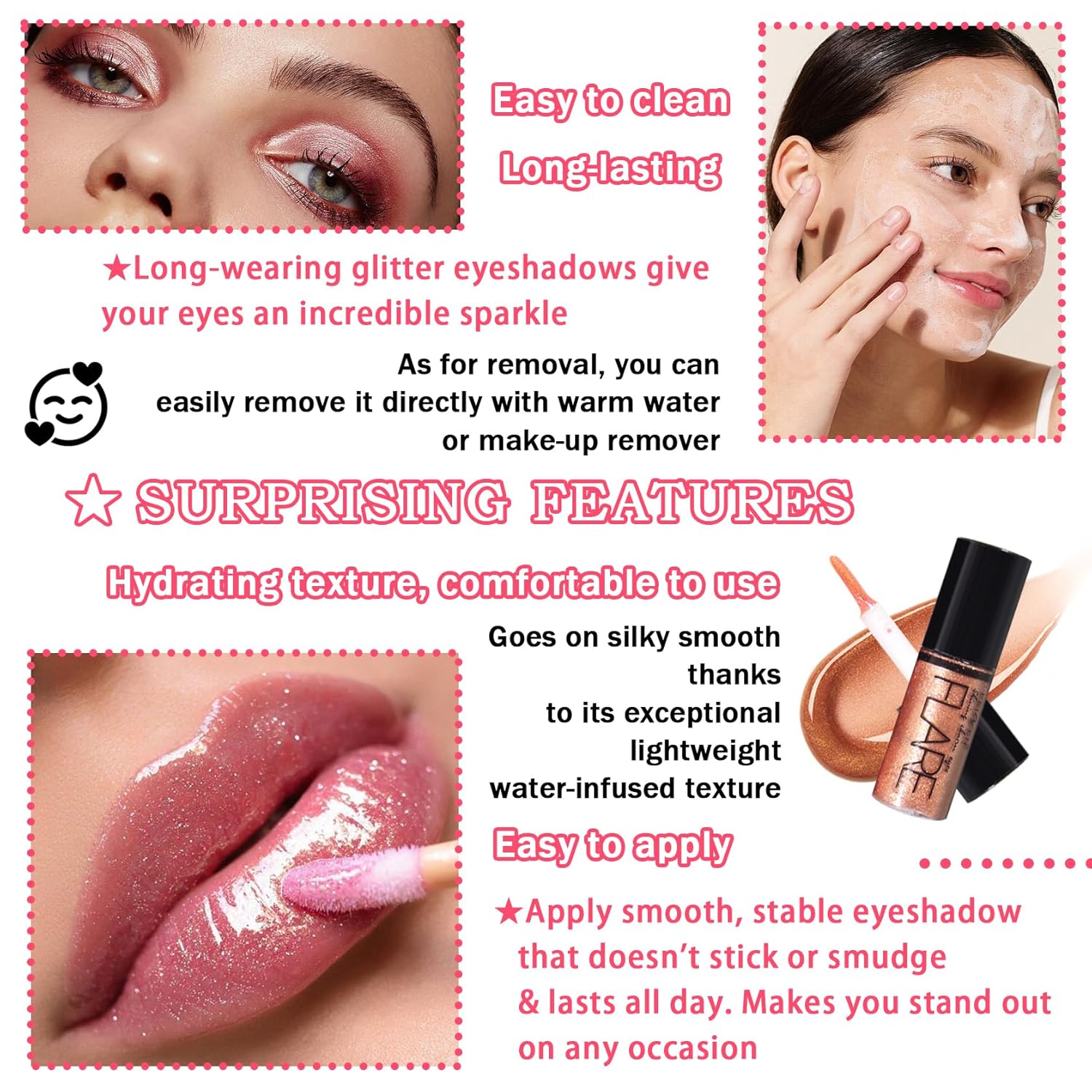 💕【Long-lasting】Waterproof liquid glitter eyeshadow is made of high quality formula, long-lasting glitter and waterproof, excellent quality, refreshing and non-sticky, quick and time-saving make-up, is the perfect choice for daily make-up.