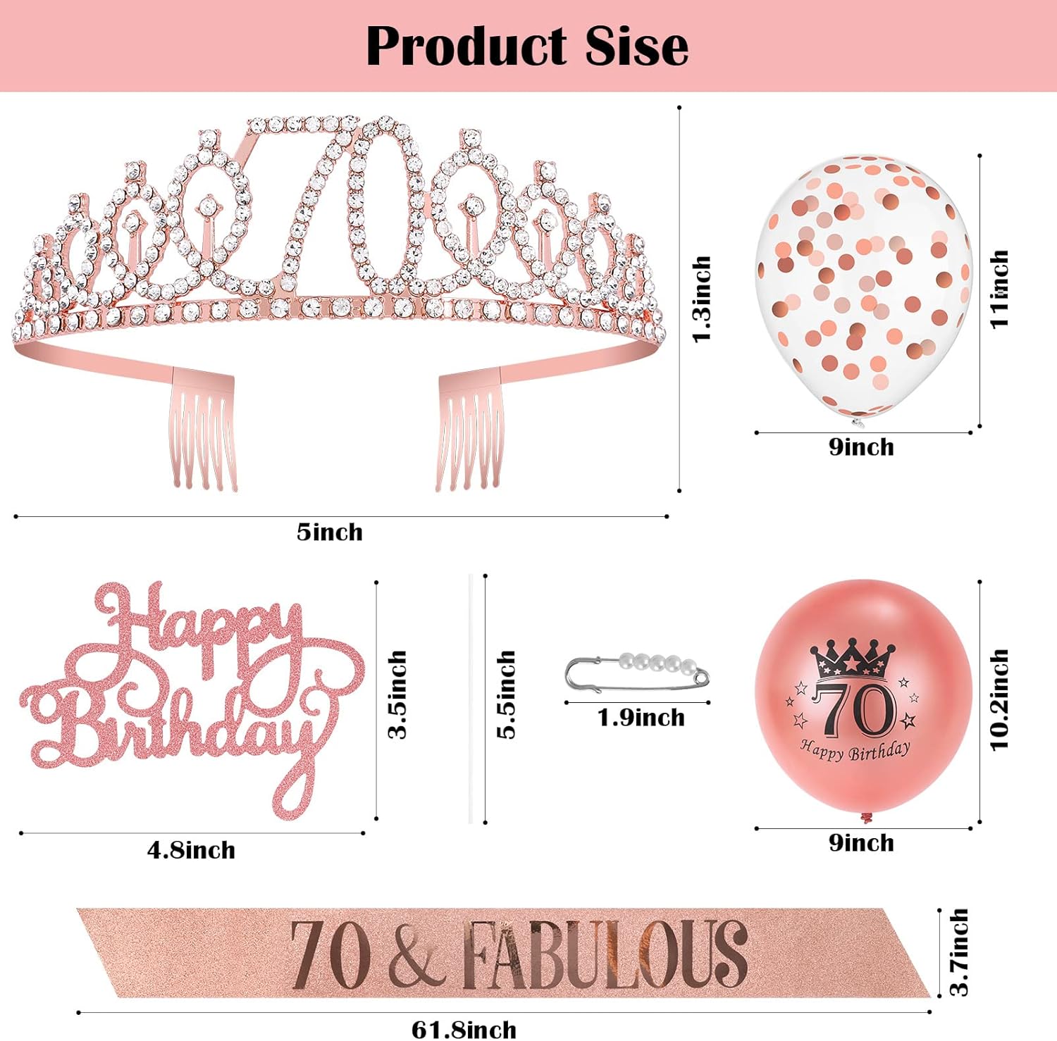 70th Birthday Gifts for Women: 70th birthday sash for women *1pc, glittery 70 birthday crown *1pc, Happy 70th Birthday Cake Topper *1pc, Pearl pin*1pc, Happy Birthday balloons *6 PCS. All be packed in an exquisite gift box.