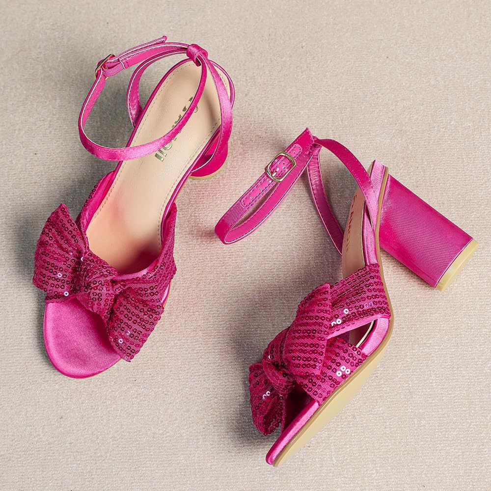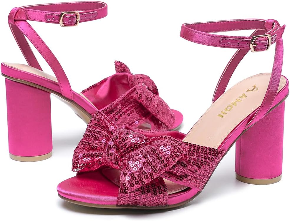 Review: The Amoji brand womenâs sequin block healed sandal is presented as a delightful fuchsia pink, open toe bowtie fronted, 4 inch chunky block retro heels with dual ankle straps fashion statement that can also be used as shoes :-)Descriptive kidding aside, these are lovely shoes that effortlessly embellish and elevate feet while simultaneously providing a reasonable level of comfort and support for safe and enjoyable use for extended periods of time. This reviewer would suggest that the overall design and execution of the shoes is rather Goldilocks in nature, not too bold or outrageous to cause wearer discomfort, but fashionable enough to project an image of self-confidence and good taste.The terms user comfort and womenâs shoes are seldom truthfully spoken when used together in the same sentence. This shoe makes a reasonable attempt to achieve a higher standard of comfort by including in sole padding for the underside of the foot and decent thickness and fabric softness to the ankle straps. As always, shoes of this nature should be ideally used sparingly for several times to gradually and comfortably bond the foot and shoe.The actual materials and construction methods of the footwear seem to project an image of decent quality and workmanship. The special guest user kindly modelling the shoes for the first time found her brief exposure to be comfortable, true to size (size 8 in the attached picture), and projecting safe stability when used.Although the term âwedding party dress shoesâ is mentioned in the title of the product description, this reviewer would suggest potential wearing occasions could also include, summer outdoor fun, nightlife and clubbing, and even office wear when used in conjunction with appropriate wardrobe choices. From fun and frolic to semi-formal and serious, there is a potential fit when matching this pleasant footwear choice with appropriate choices in overall wardrobe and fashion accessories.Conclusion: The Amoji brand womenâs sequin block healed sandal is a delightful fuchsia pink, open toe bowtie fronted, 4 inch chunky block retro healed, footwear choice. An overall product score of 5/5 is assigned accordingly.