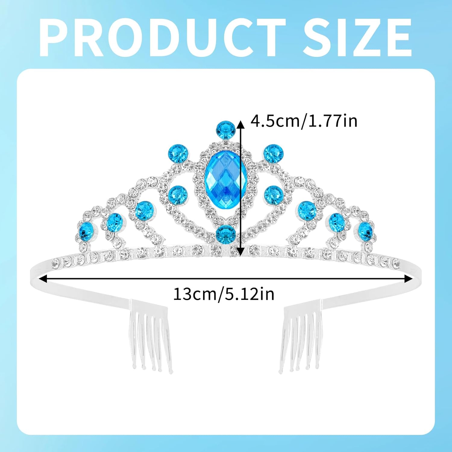 Review: This tiara is made with bright light blue gems. This fits my 9 yo daughter but this is a little bit too small for me. It should be good for toddler too. It is well made. This is easy to wear and comfortable. This is lightweight and it was staying on without moving, despite my daughter moving and dancing with it. We really like it for a princess pretend play.