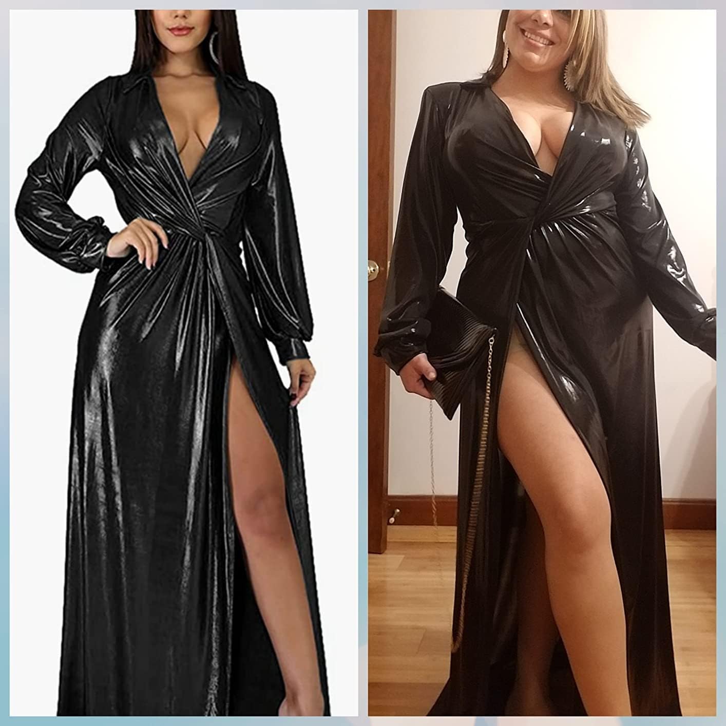Review: For reference, I’m 5’5, 150# athletic build with 38DD bust and I purchased a size medium. The dress length stopped at my ankle bone, so unless you’re 5’0 tall it’s just not going to look like the image. The material is also extremely sheer, so you would have to wear shape wear or a body suit or something underneath. Obviously it’s crinkly when it arrives but I think from a distance the dress would look nice after it’s been steamed, but it has too many other offenses against it. It didn’t fit my bust area, and it has this weird little partial collar that didn’t lay right or make any sense visually. The split is also very high (starts at the waistband) but with the wrapping effect it’s masked somewhat – this is personally my favorite part of the dress, but be wary of breezes. One good gust and it’s suddenly very revealing.