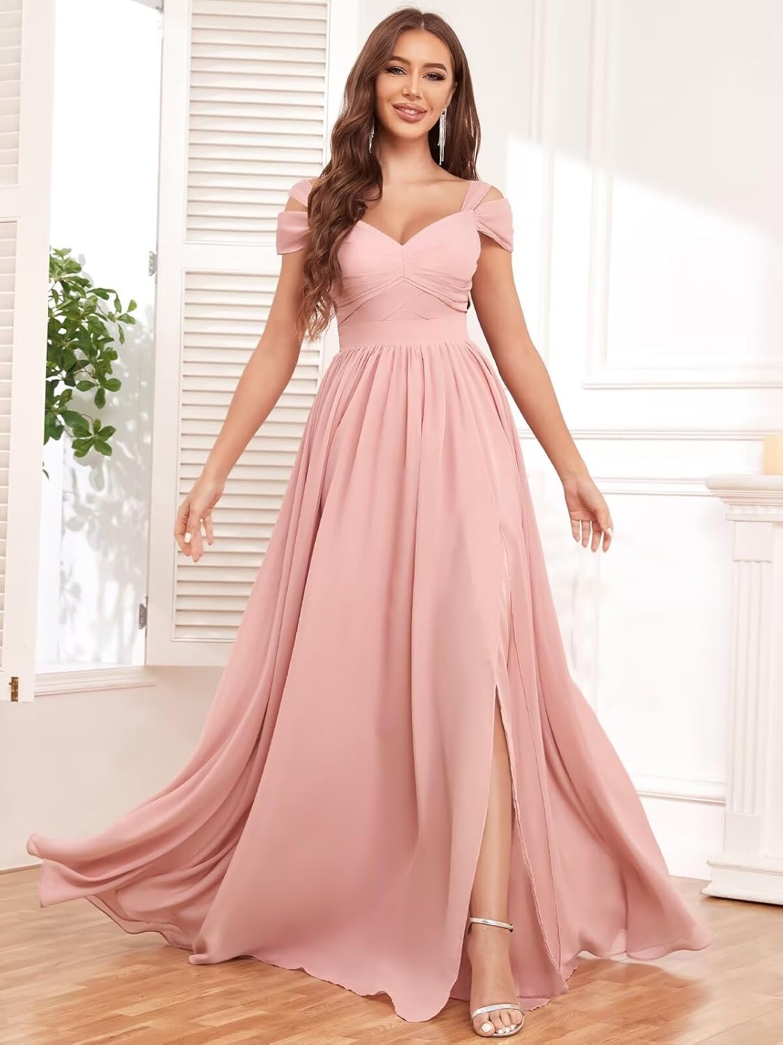 Cold Shoulder Bridesmaid Dresses Long for Wedding Ruched Chiffon Formal Gown