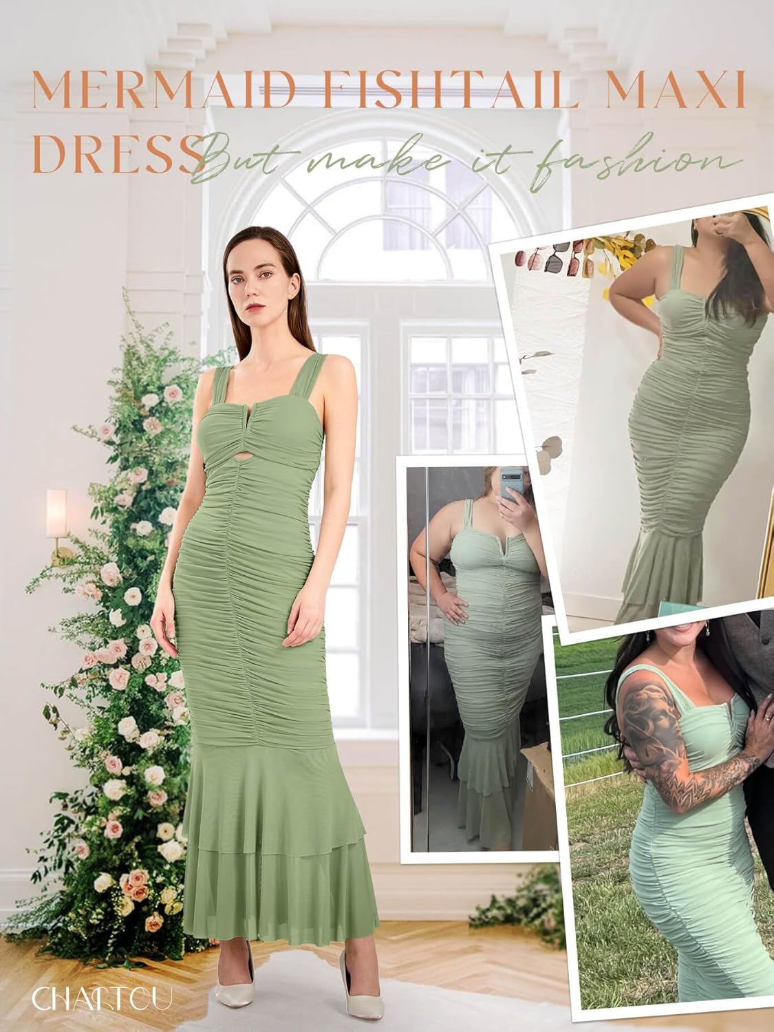 Review: I wore this to a wedding. First off, the green shade is the perfect tone. It was giving total mermaid vibes. The fabric looks & feels expensive. There is boning in the v cut-out giving the top portion some extra structure. Also ample coverage even for larger chest girlies. The double tier skirt allows it to be tall girl friendly even in 3.5inch heels. Overall, VERY satisfied with this dress. Received many compliments. What a great find! Love it. Donât hesitate. Itâs extremely stretchy as well. Would fit multiple sizes/figures. I am 5â7â 135lbs. I ordered a small and honestly there was plenty of give even for a size 6 maybe even 8. It has a concealed zipper in the back that I didnât even really need to utilize being the fabric has so much give. Sheâs really a beauty.