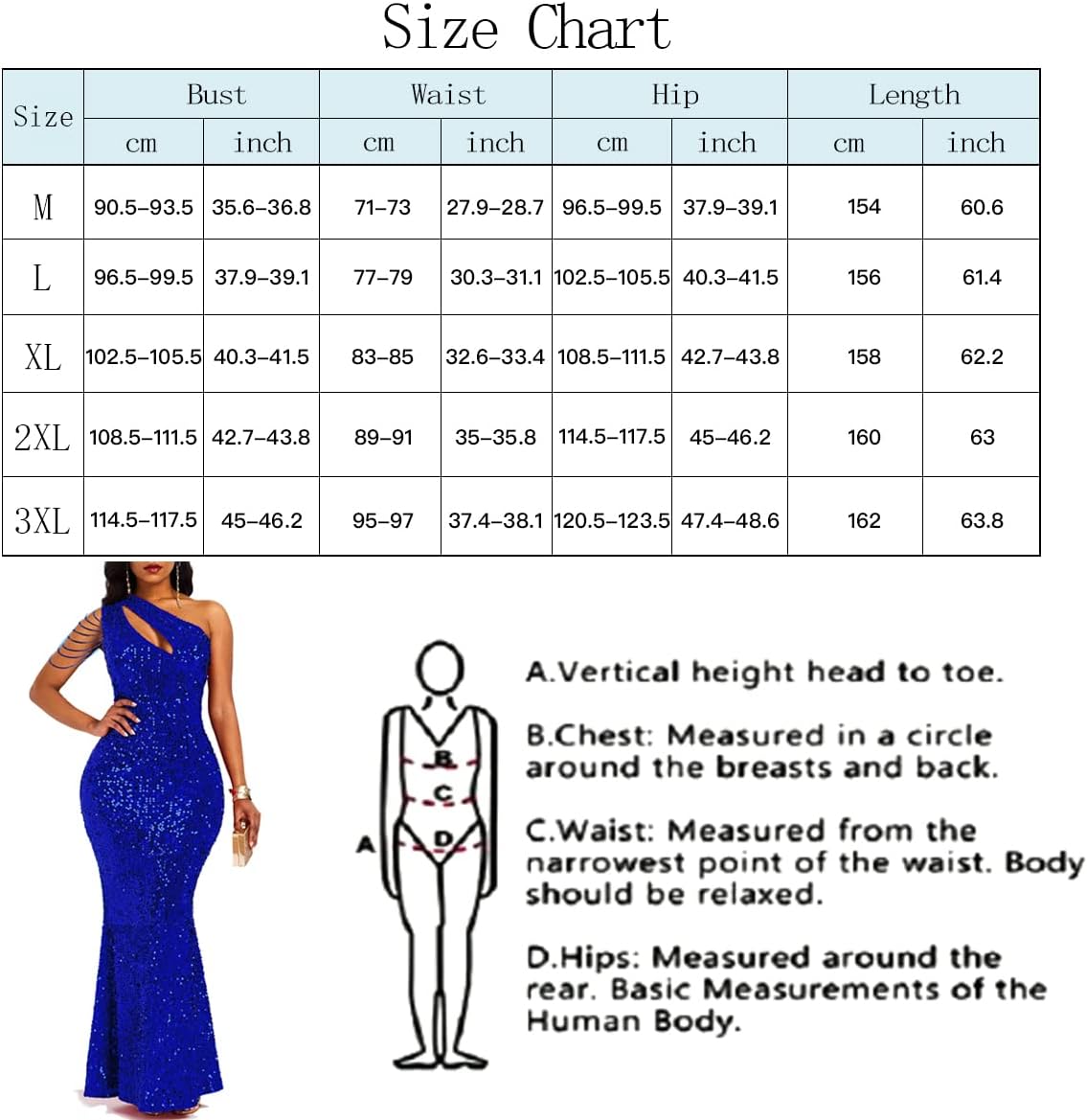 Review: This is the first time I am writing a review on Amazon products. This dress is so nice. I fit so well. I like the sequin. I currently weigh 153LB, I am small at my upper part and thick at the bottom. My bra size is 34B and my bottom size is usually between size 8 to 10 or medium USA size. I am 5.2ft tall. I got a size medium, the length is perfect. Not too long, it will rest well on your heel, if you put on one. You can still rock it without heels, It would still fit well. It fits my hips perfectly. It also fit my upper part too. Although, it was not too clinging to my upper part which is not visible to anyone. It would fit perfectly for someone with bigger bust as well because it has a lot of room to stretch. What you see is what you get. The only complain I have is the zipper. It has a good invisible zipper, however, the sequin was also on the way of the zipper which could affect the zip. This is not a big problem because you can just easily remove all the sequin on the tip of the zipper, and the zipper would work perfectly.
