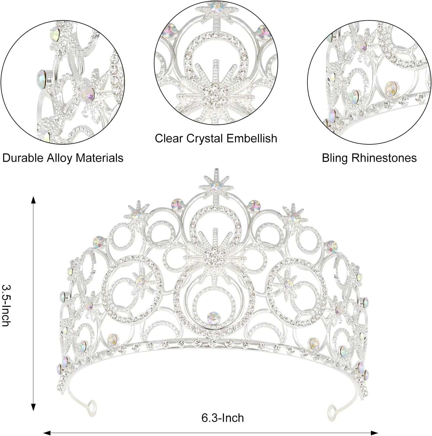 This silver rhinestone tiara crown features a dazzling circular star design with sparkling crystals that reflect light beautifully. Made from durable silver-tone alloy, it is lightweight, comfortable, and designed with secure side loops for a stable fit. Perfect for weddings, proms, pageants, quincea?eras, birthdays, and cosplay, this elegant crown makes you shine like royalty on any occasion. Its brilliant sparkle and timeless design add glamour and sophistication, ensuring you stand out and create unforgettable memories.