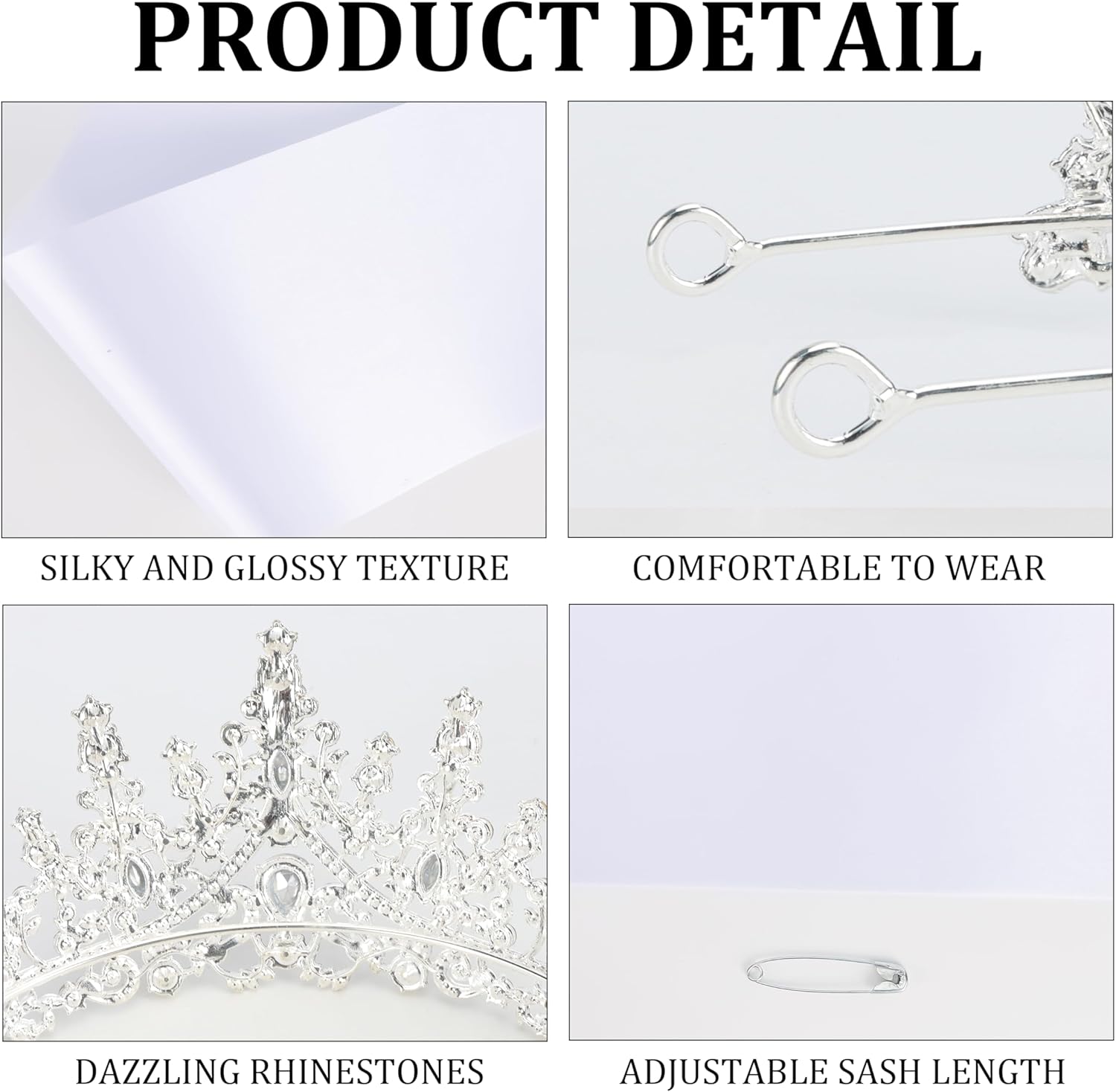 Review: The tiara is beautiful. One of the nicer fake crowns I’ve seen, at a very affordable price. However, the tiara does not have any combs to attach to your head. You will need to find clips and bobby pins to try to make it stay on.The sash is a durable material. As far as the sash being customizable, yes, technically you can call it that – the same way a blank piece of paper is customizable. The set does not include any kind of iron on lettering to customize your sash, so you would have to go purchase that separately.