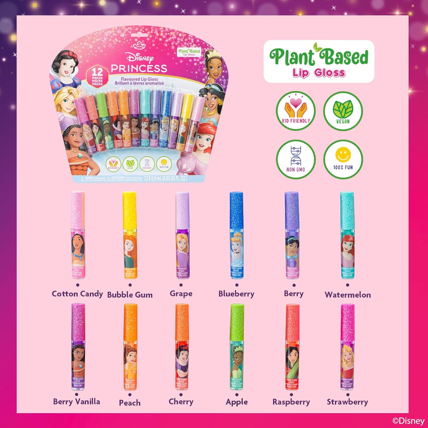FAVORITE CHARACTERS – These glosses are decorated with her favorite Disney Princesses such as Cinderella, Ariel, Moana, Tiana, and more. Kids will have fun showing their friends this sparkly gloss.