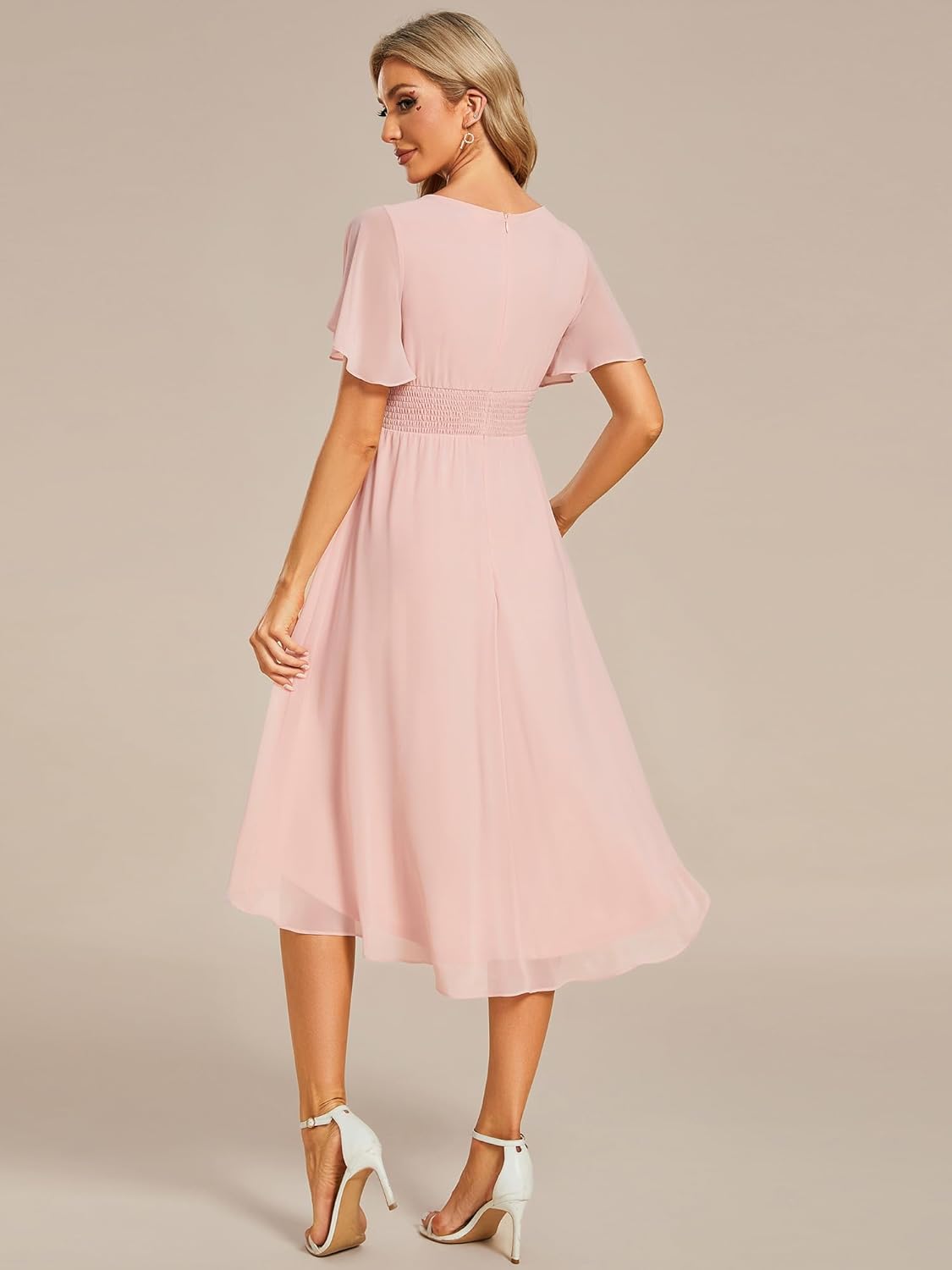 This A-line chiffon dress is a timeless piece that combines classic elegance with modern style. With a knee-length hem, short sleeves, and a round neck, it’s versatile for any season