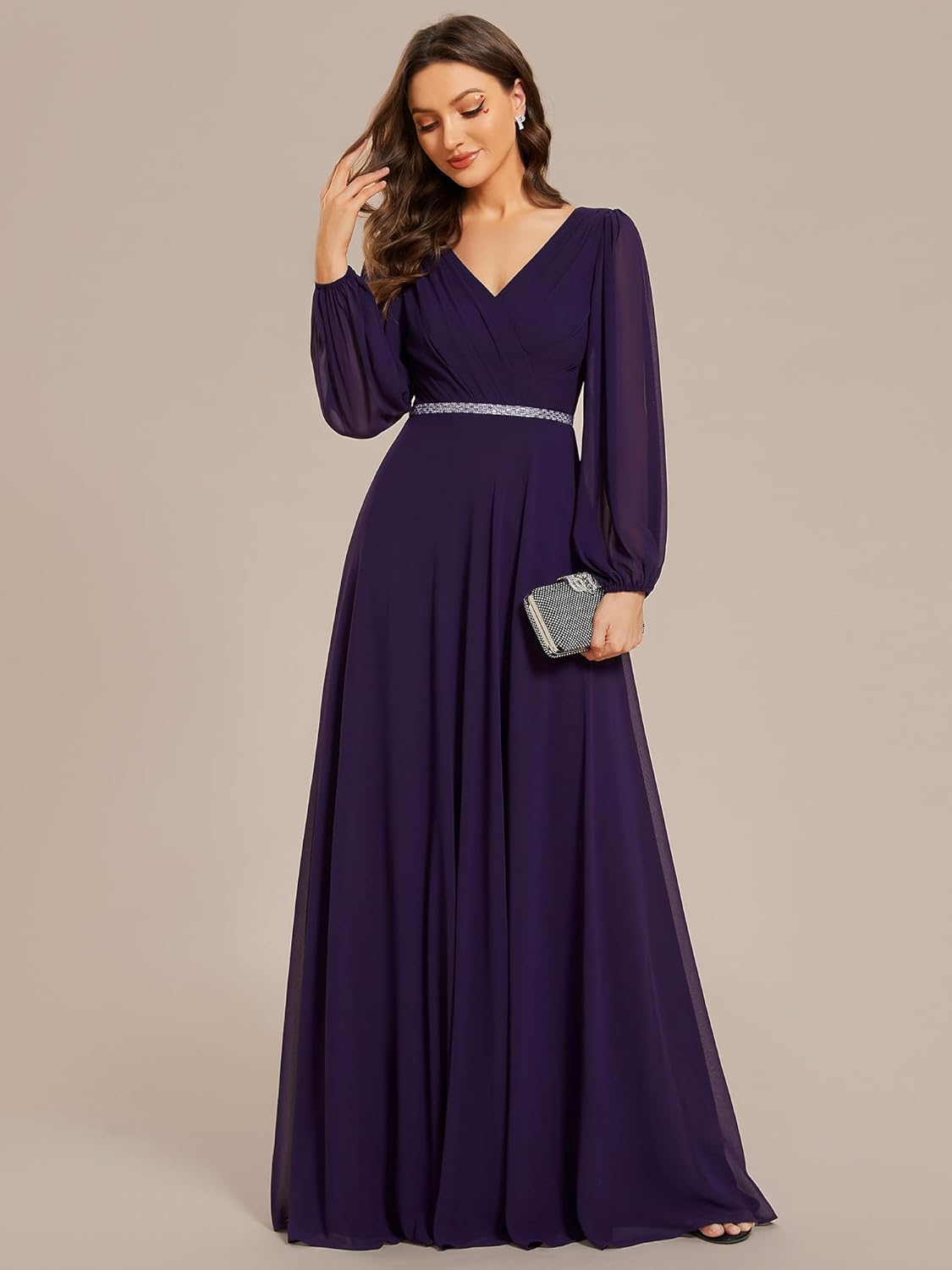 Make a stunning entrance at your next special event in our Pleated Double V-Neck Long Sleeves Shiny Belt Chiffon Evening Dress. The flowing chiffon fabric drapes beautifully, while the pleated details add a touch of sophistication.