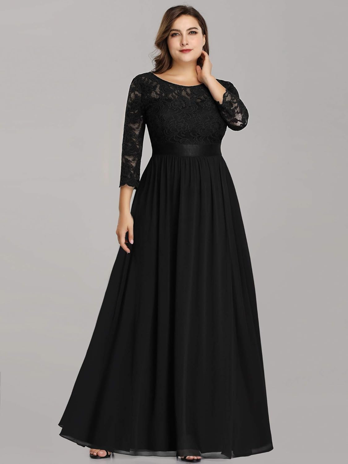 When the occasion calls for a chic and elegant look, go in for this flowing see-through lace plus size formal evening dress.