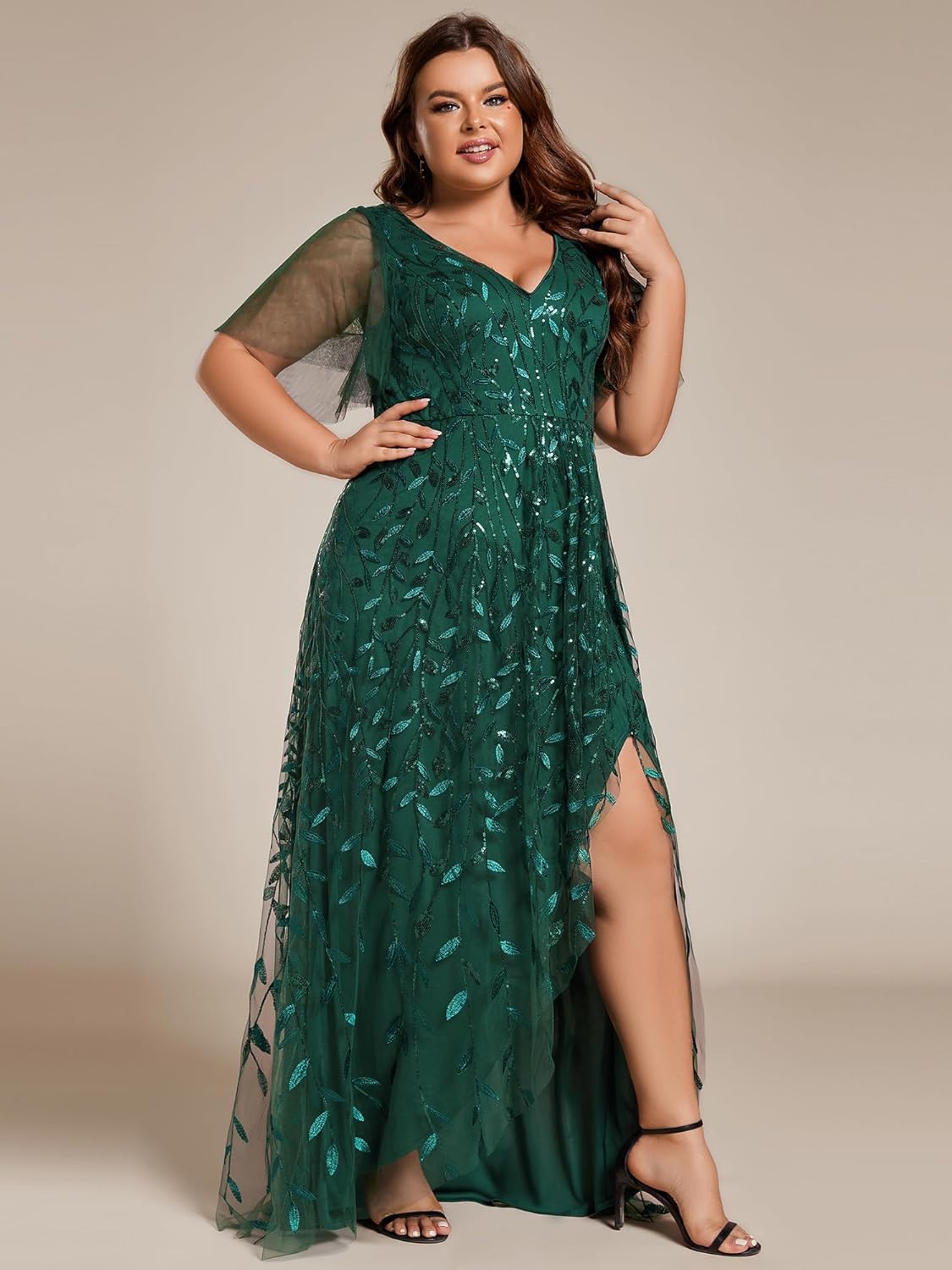 Flatter your curves and make a statement in this stunning plus size v-neck sequin dress. Designed with short sleeves and a high low hem, this A-line silhouette dress features sequin embellishments that add a touch of glamour.