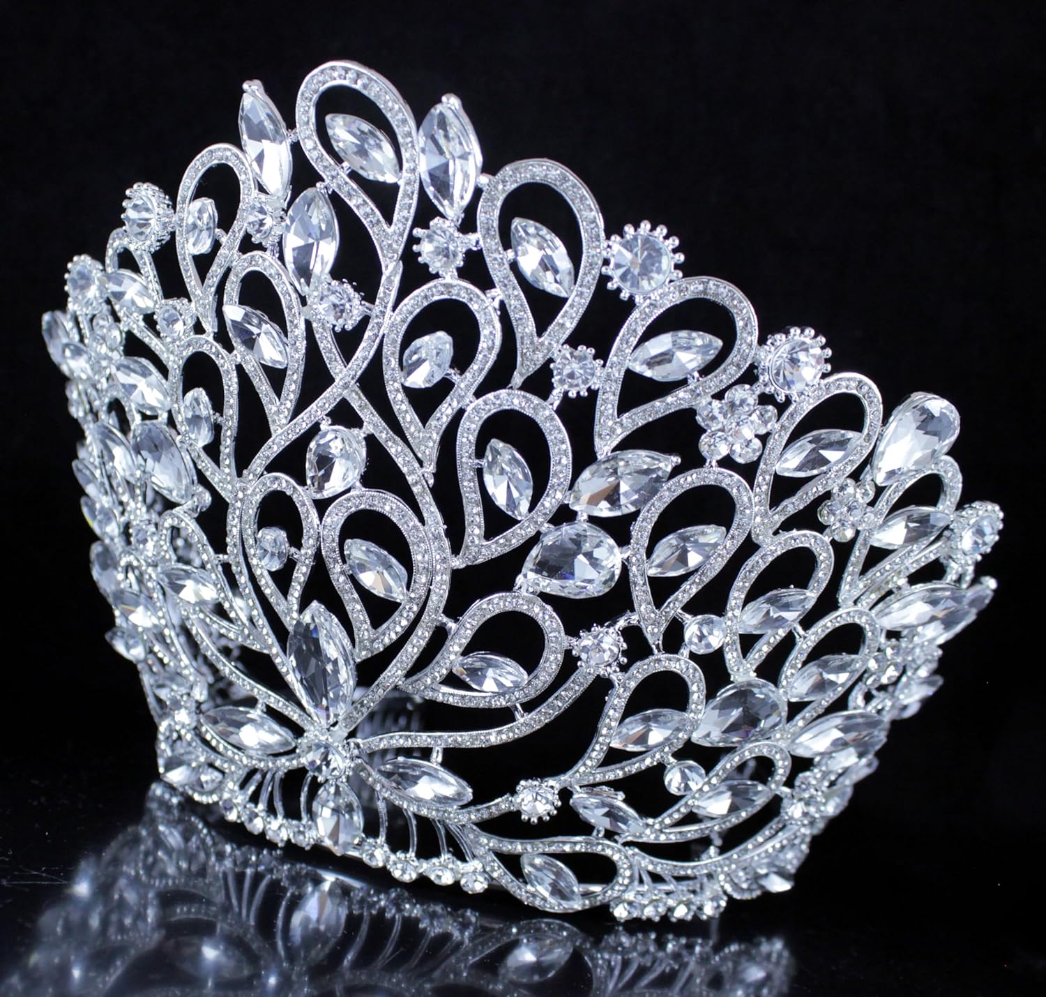 This is fancy large beauty queen Austrian rhinestone tiara crown with hair combs in a beautiful floral design. Glittery Clear Austrian rhinestones are heavily set on Silver-plated metal. Rhinestones go all the way to the back of the tiara. All rhinestones shine a lot! Sides hair combs for extra security. This tiara is perfect for wedding, party, prom, pageant or any special occasions!