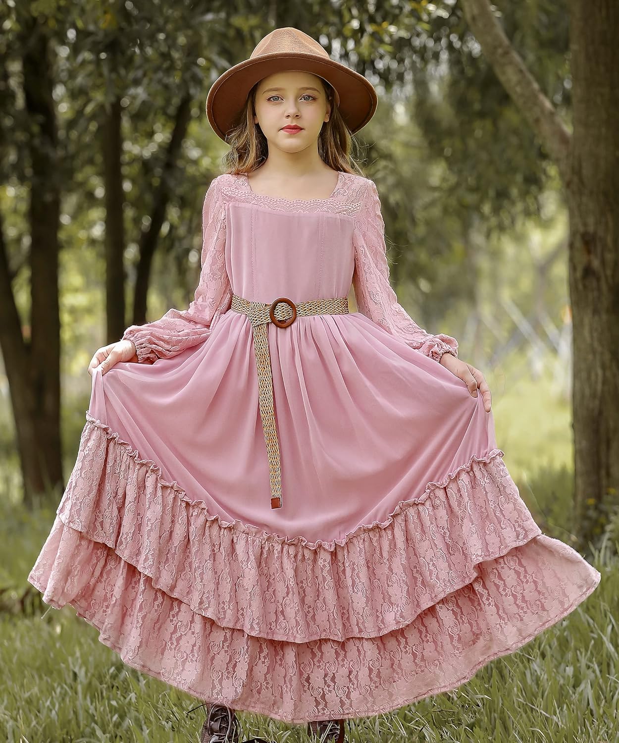 Review: This dress definitely has some stretch to it. It has a âslipâ skirt under the dress itself. I bought this a size larger than my daughters due to the look I wanted. In doing that Iâll say the chest was larger than I liked. The sleeves are beautiful and the lace has a stretchy feel to it. I did end up changing out the belt because it wasnât my particular taste but still has potential for other outfits. Great buy for sweet girls!