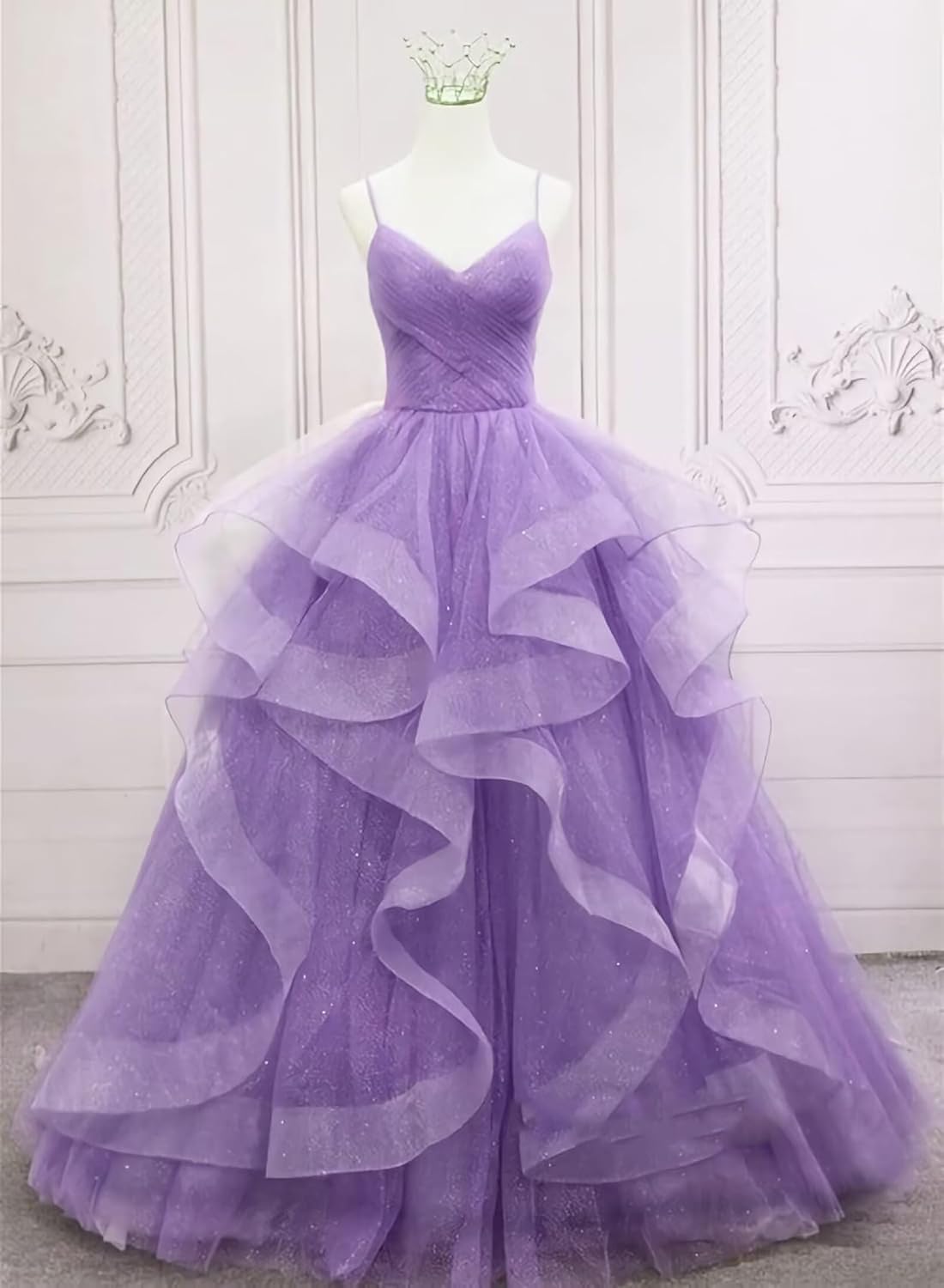 Glittering Tulle Tiered Puffy Long Prom Dress Spaghetti Straps Ball Gown