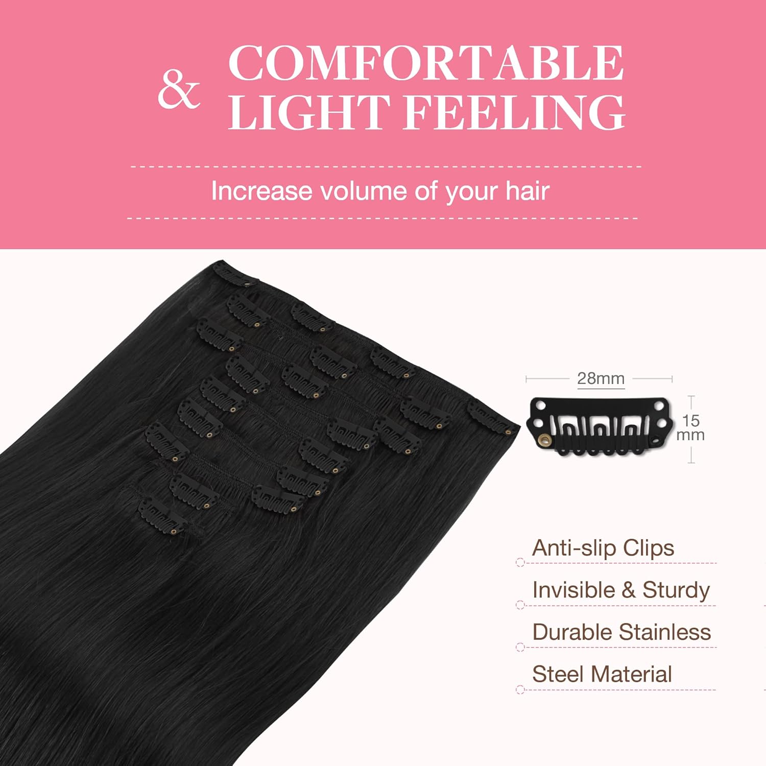 High Quality Clips, Quick to Wear: Slim, silicone backed clips with a PU design make our extensions invisible, comfortable, and lightweight. Securely stitched and cushioned, they protect your scalp and hair. Easy to apply, perfect for any occasion