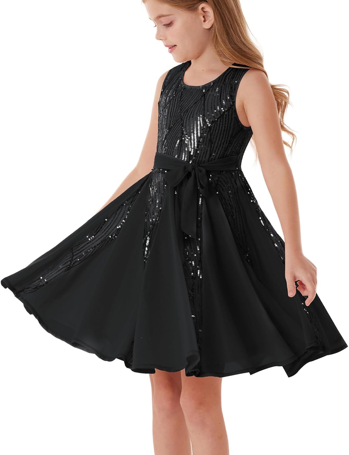GRACE KARIN Kids Sequined Party Dress Girls Sleeveless Crew Neck Flared Dress