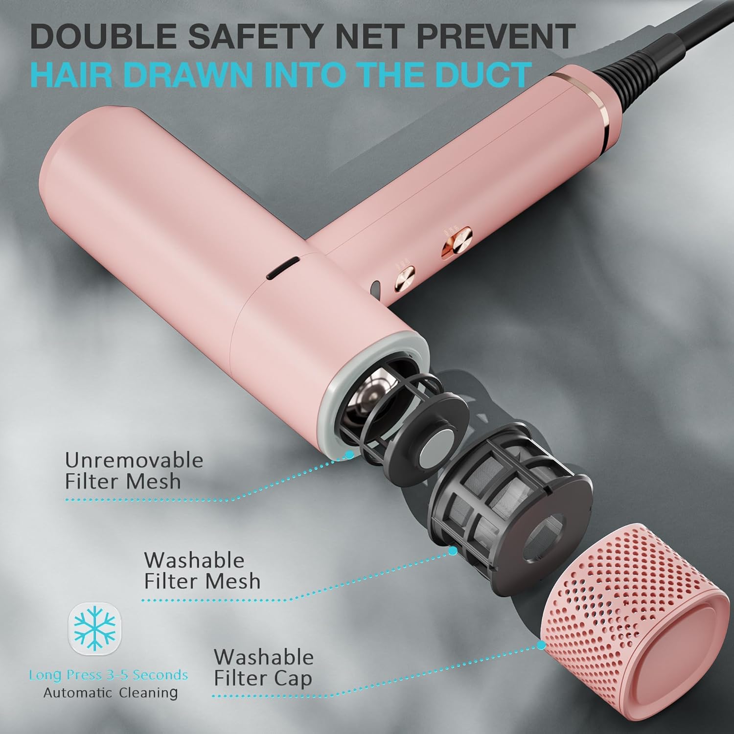 Lightweight and Portable: This is a sleekly designed lightweight and portable travel hair dryer with an ergonomic design weighing 1.21 lbs/549g. It has a comfortable grip and simple buttons. Features a detachable secure filter mesh to prevent hair from entering the air duct, providing a safe user experience. Equipped with a 360°rotating magnetic nozzle, it can meet the different needs of all hair lengths or hair types. It is ideal for home and travel