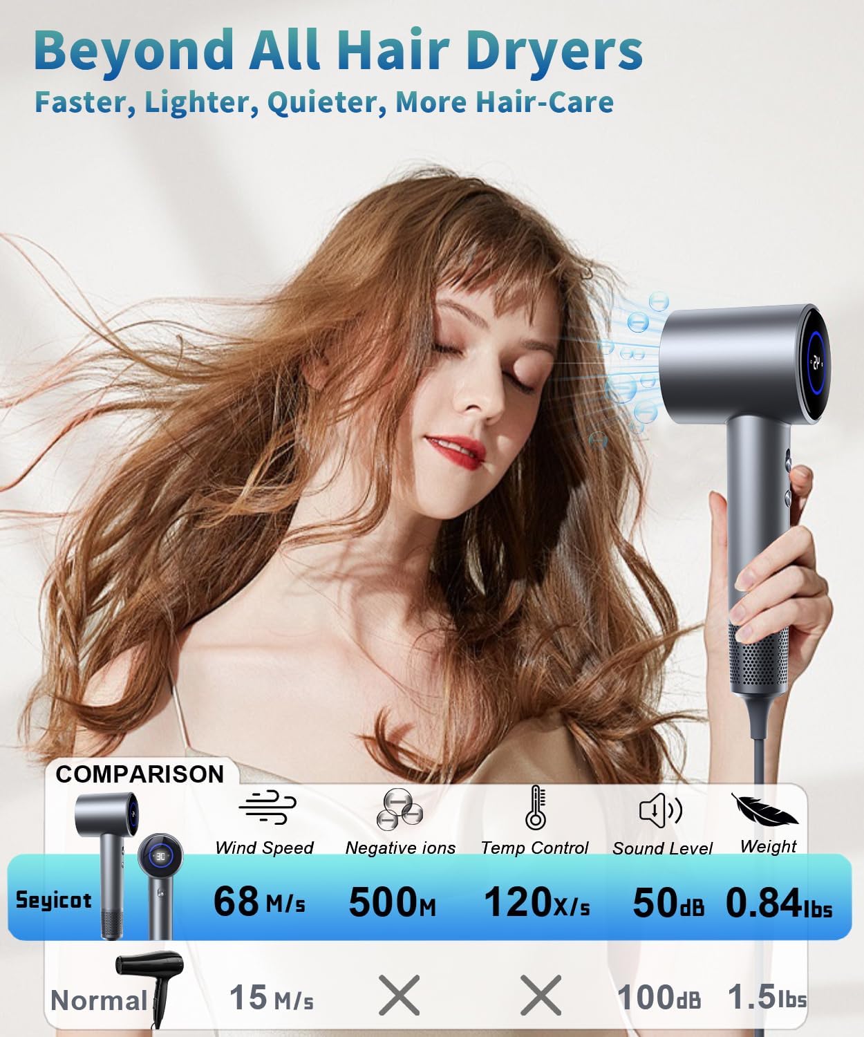 【Efficient Hair Care Experience】The High-Speed Hair Dryer brings you a lightning-fast drying experience! With a maximum wind speed of 68M/s, it can instantly remove moisture from your hair, making your hair instantly full of vitality. The drying speed is 5 times faster than other hair dryers, and the efficiency is increased by 90%. It only takes 1 minute to dry short hair, 3 minutes for medium-length hair, and 5 minutes for long hair. Seyicot is committed to improving your hair care efficiency and making your hair care routine efficient and enjoyable.