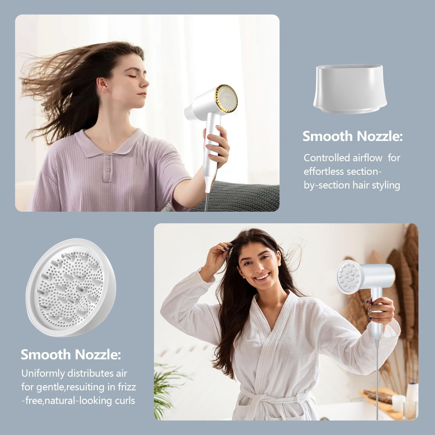 Versatile Styling:Hair dryer with diffuser and nozzle to help you achieve different styling effects.The diffuser suitable for curly or wavy hair, as it distributes airflow evenly,reducing frizz for bouncy, voluminous curls.the nozzle focuses airflow for straightening,creating smooth, sleek finishes with added shine