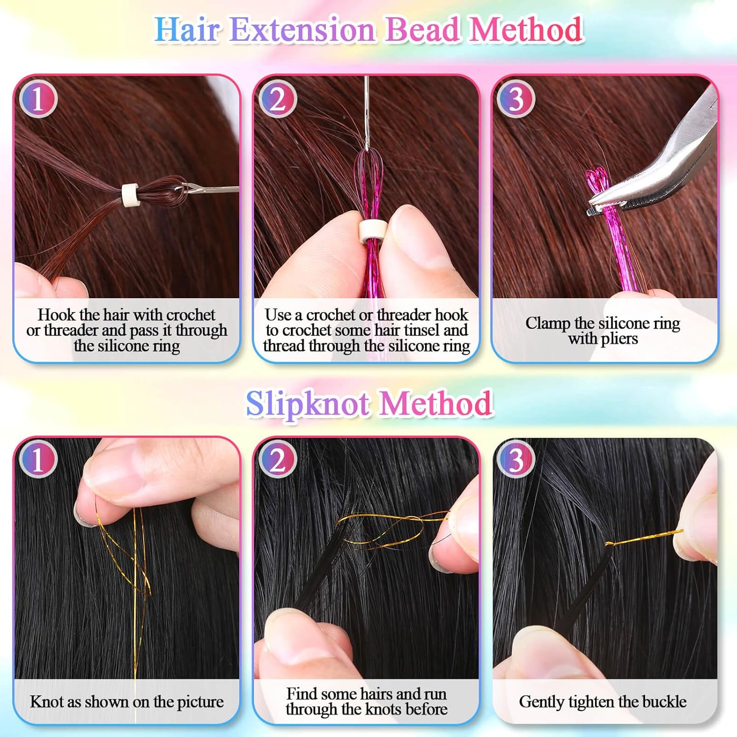 【8 Accessories to Use】Hair tinsel kit for girls comes with 8 hair styling tools to help you easily organize your hair and hair extensions. You can choose to use the micro hair extension beads or slipknot to connect the shiny hair tinsel and soft feather strands, the micro hair extension beads will keep the shiny hair tinsel in your hair for weeks, they are extremely small and light so they won’t interfere with your hair washing, combing or sleeping routine.