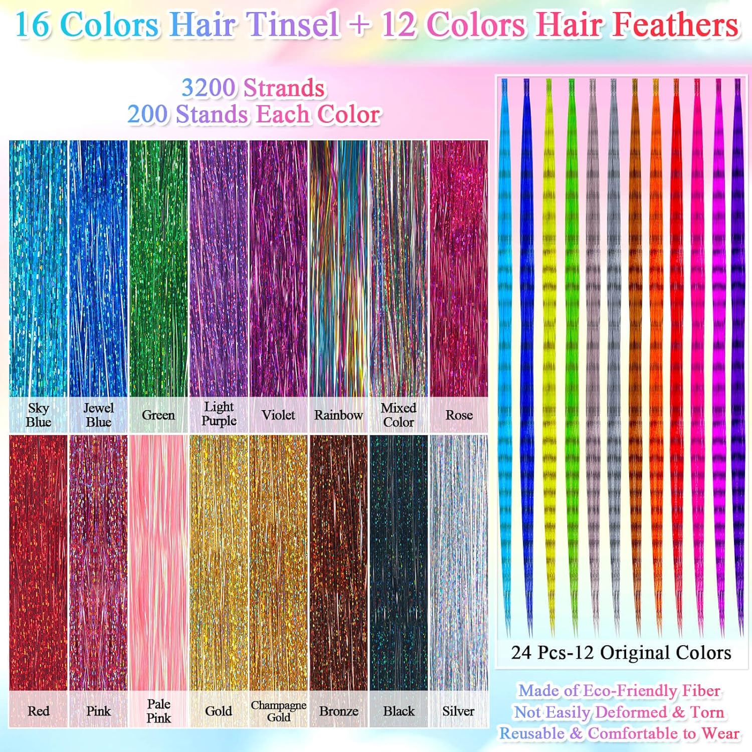 【Hair Tinsel & Hair Feather Kit】Heat-resistant hair extension kit includes 3200 strands of hair tinsel in 16 colors, 24 pcs hair feathers in 12 colors, 250 pcs micro silicone hair extension beads in 5 colors, 1 crochet hook, 1 threader, 1 plier, 1 rat tail comb, 4 hair clips, 2 ponytail hoop tools, 1 instruction sheet for operation, 1 sheet of colorful self-adhesive rhinestones as a gift. Complete hair tinsel extension kit to facilitate your hairdressing up and DIY.