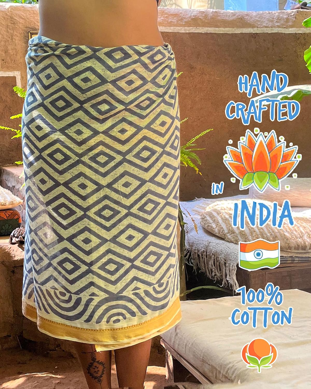 Hand printed cotton sarongs with gold ethnic border