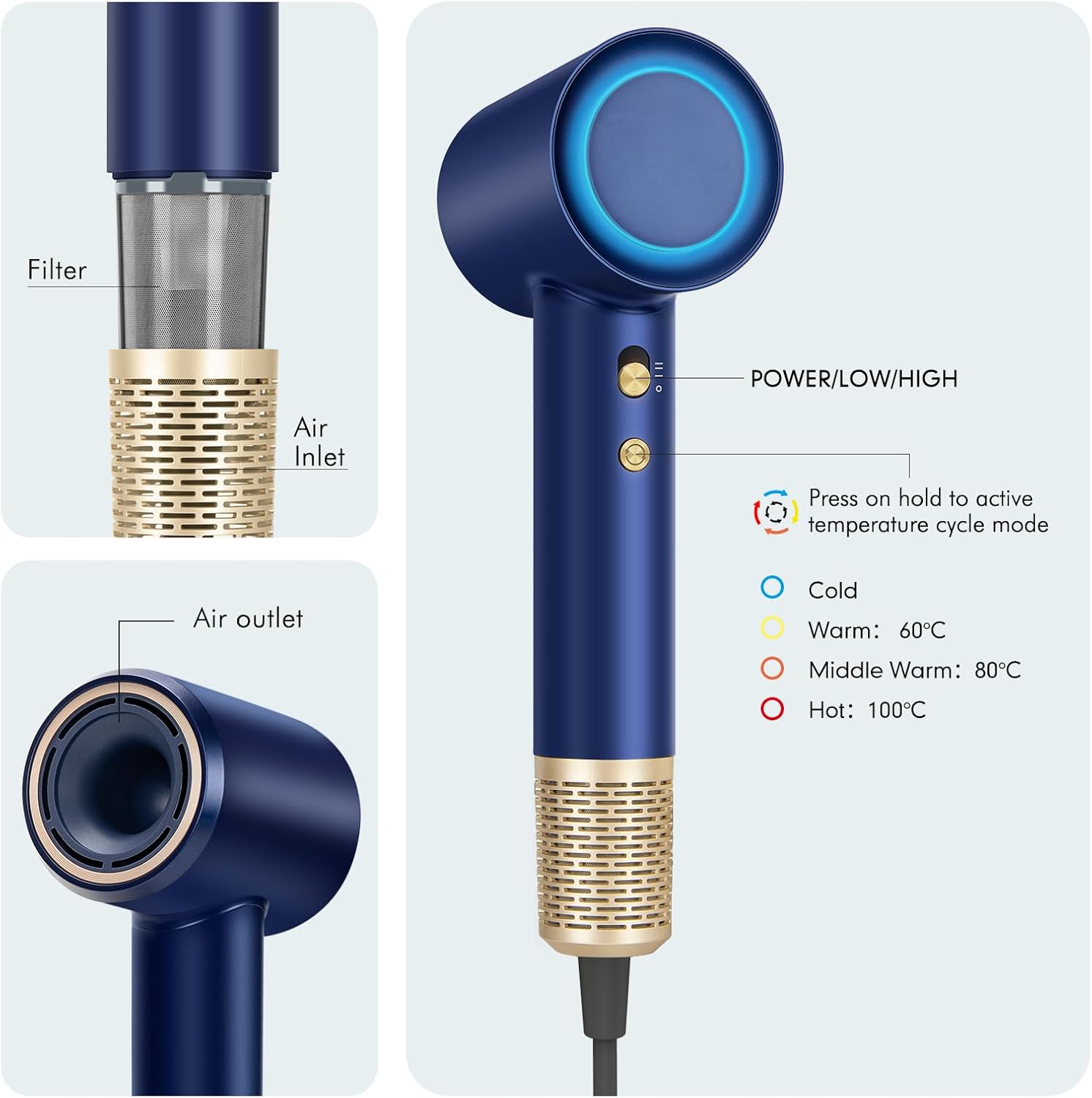 Quiet Operation with Adjustable Settings – Features 4 temperature options and 2 speed settings for personalized styling. The low-noise design operates at just 65db, ensuring a quiet drying experience without disturbing others. Cold/Hot air mode can be activated by holding the button for 2 seconds.