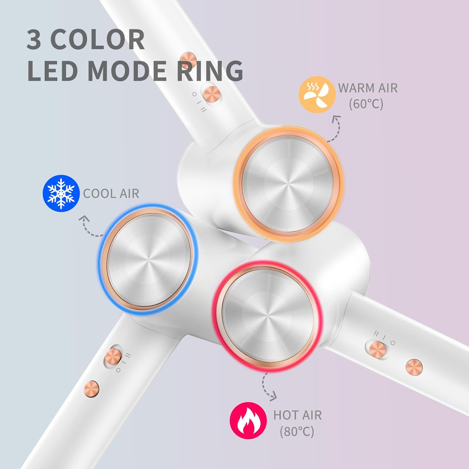 Adjustable Settings & Easy Operation: The blow dryer is equipped with an ALCI safety plug(1.8M). With 4 temperature Settings (room temperature /140F/180F/ hot and cold air cycle) and 2 speed options, the LED ring light can be changed to different colors (red: 180F hot air, yellow: 140F warm air, blue: Room temperature), Long press 2 seconds, hot and cold air automatic circulation (2s hot air 2s cold air). The hair dryer only weighs 480g and the noise is only 58db.