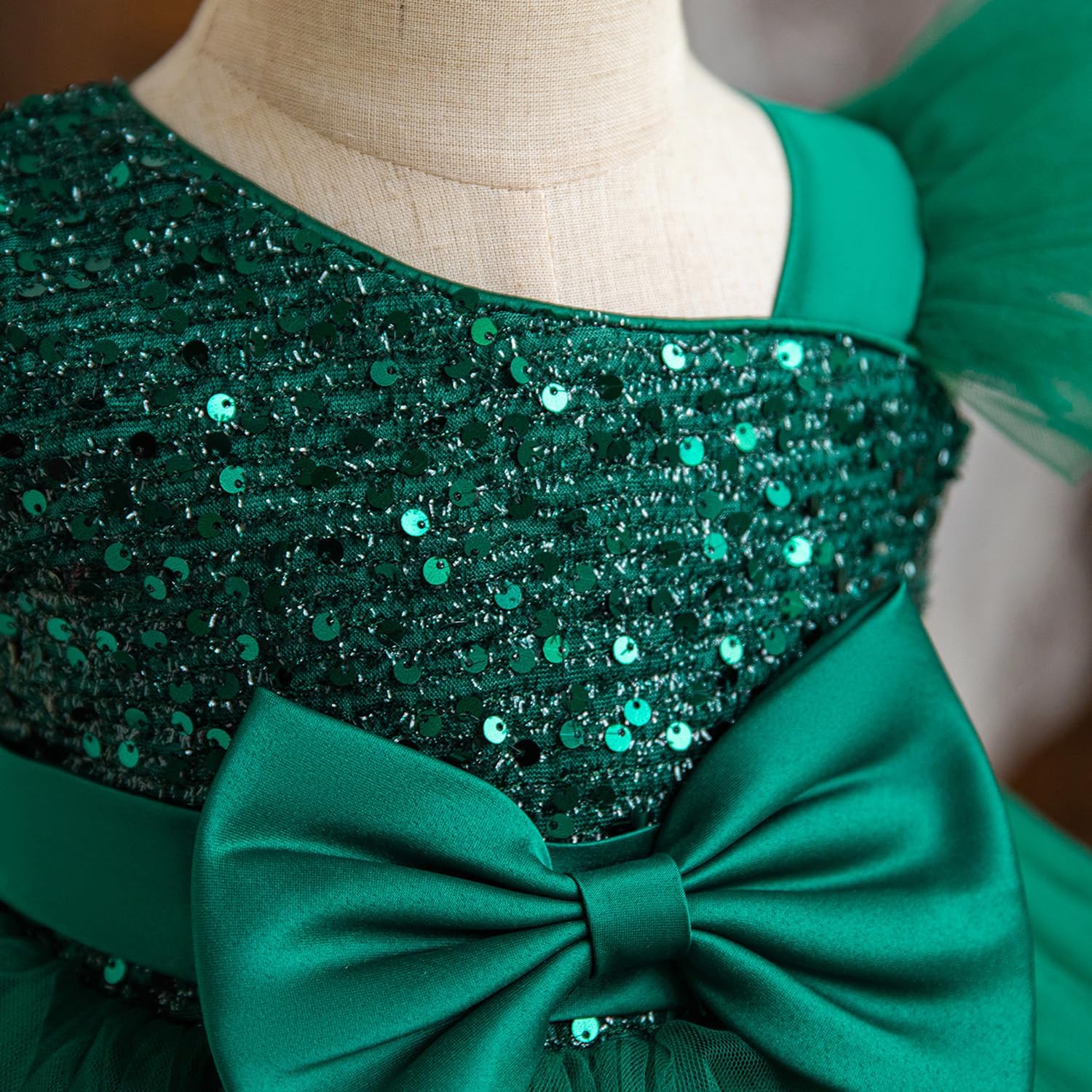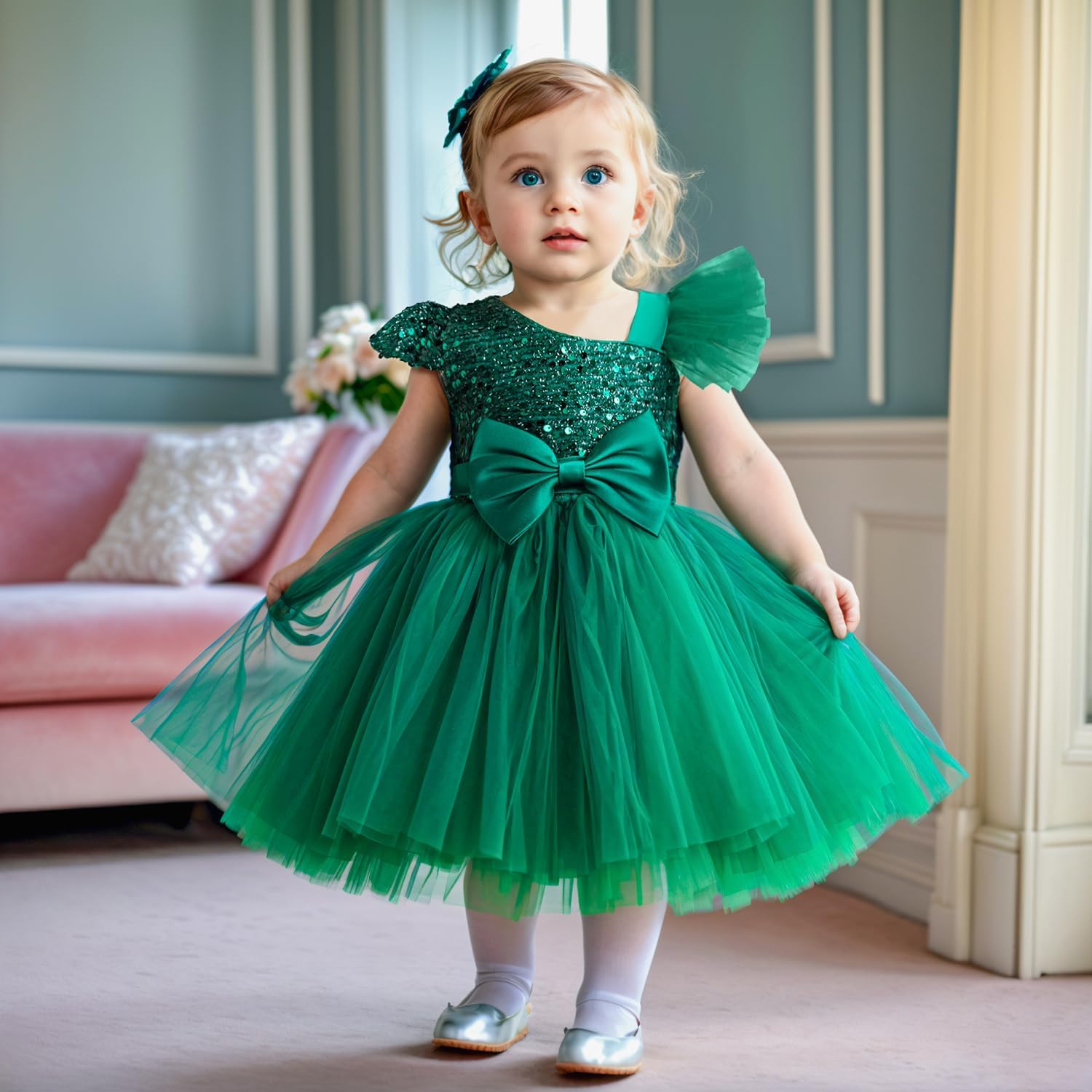 Colors: Hot Pink\Green\WhiteBow hair accessories, Shinny Sequins, Ruffles Sleeve, Ball Gown Dress, Knee Length, Elegant Dresses for Princess Girl.The skirt is decorated with stars sequins and is designed with ruffles sleeve. It looks as a fairy and lovely when dancing, and it must be very eye-catching.Perfrect for any seasons: Spring, Summer, Autumn, Winter.