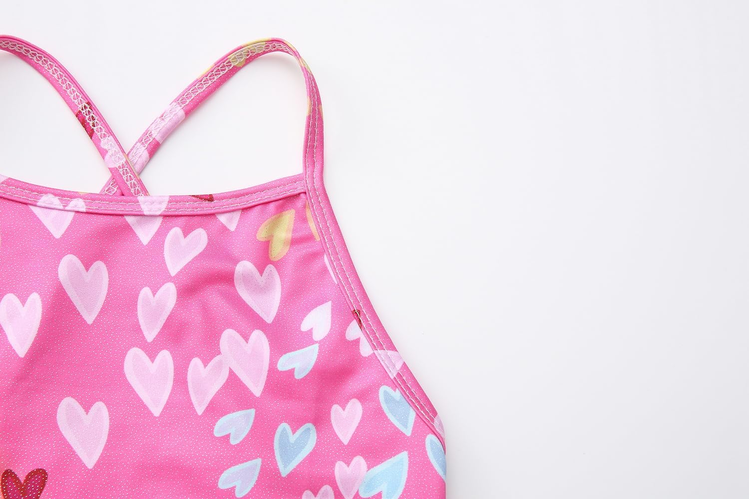 Review: I got this iLover Girls Sparkle One Piece Swimsuits Crossback Swimwear Beach Bathing Suit for my granddaughter and she loved it. Very vivid colors, nice pattern, good fit. Fabric is very thin, so I do not expect to last long especially as she rubs the swimsuit against the sand while playing in the shore. Stitching is around average quality but for a kid swimsuit I would have expected more reinforcement.All in all, a nice swimsuit but do not expect it to be around long.