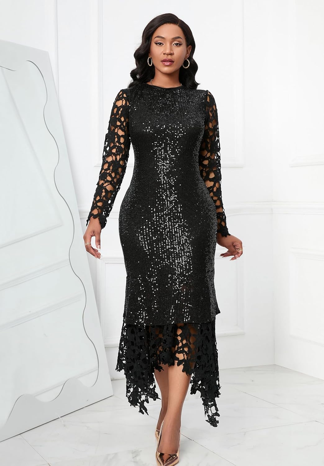 IWFEV Sequins Floor-Length Hollow Asymmetrical Women’s Maxi Dress Lace Dress Party Evening Dress