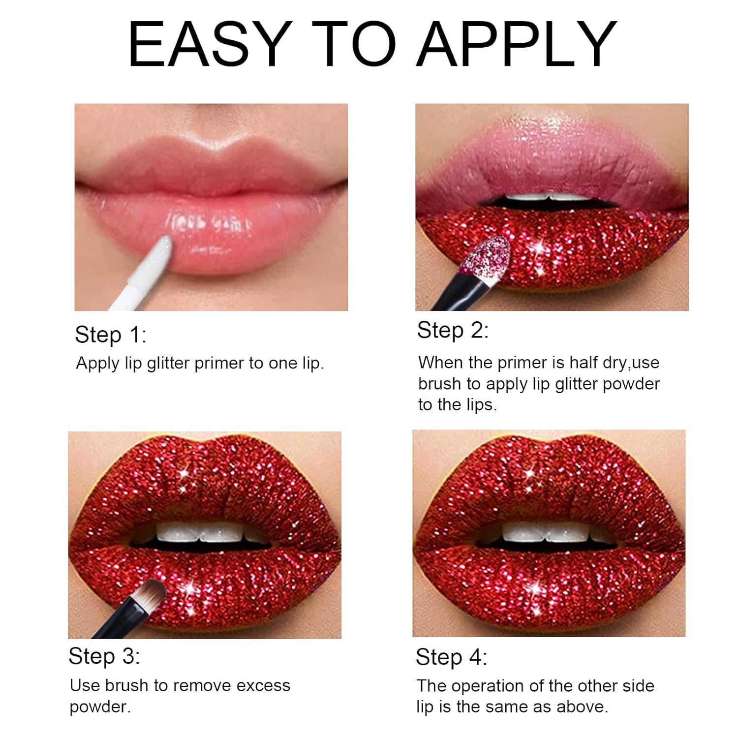 【Easy to Apply】This set comes with a clear lip gloss base, apply to lips before use, then use tool dipped in powder to apply directly on lips for a shimmery perfect lip finish.