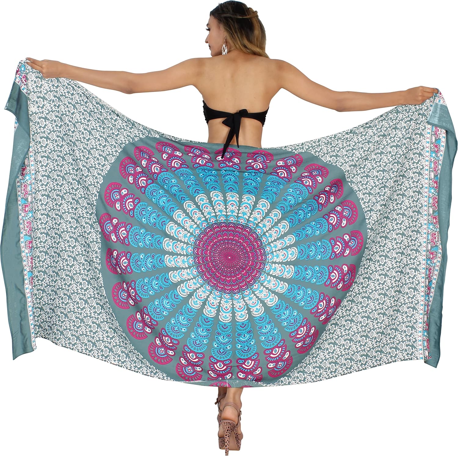 Review: I really liked this sarong. Beautiful, color did not bleach out after using for days in the sun while rafting the Colorado River. I liked that it did not have any fringe. Used it on the water to provide shade for uncovered legs or to wrap around neck during hikes to keep cool. At camp, used it cover up while changing and to provide cover while showering. I can’t imagine taking a trip without a sarong after going on the trip, and this sarong worked perfectly. I had many compliments on the mandala design. Other sarongs did bleach out with all the daily sun use but this one came through the trip perfectly.