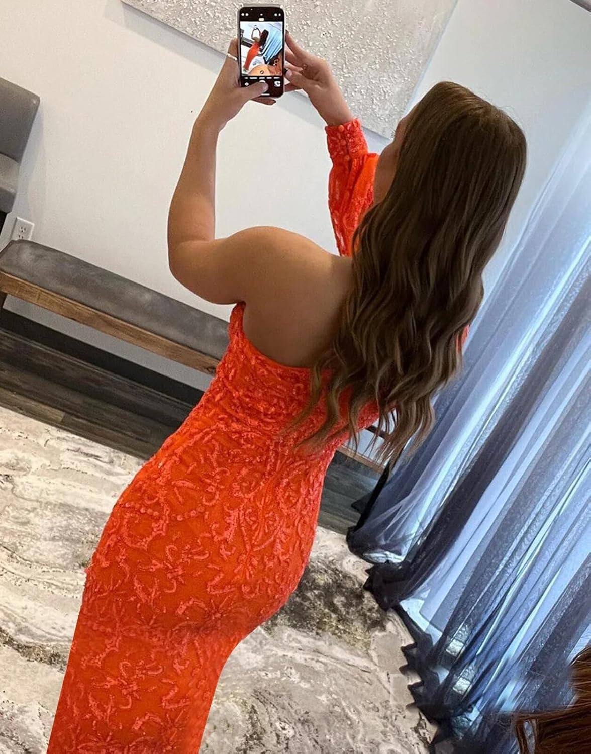 Orange Prom Dress long for Women Sparkly One Shoulder Long Sleeve Formal Gown