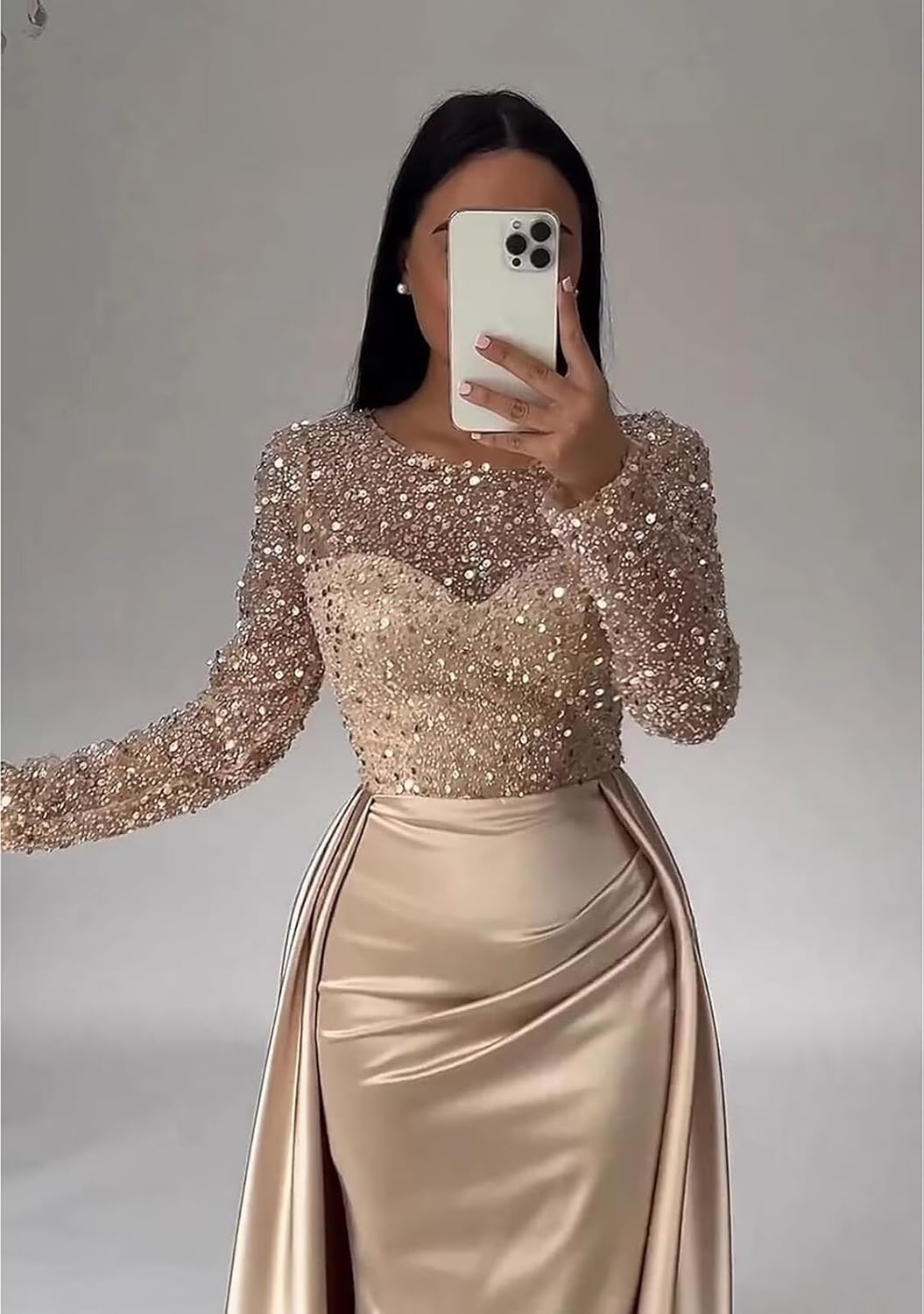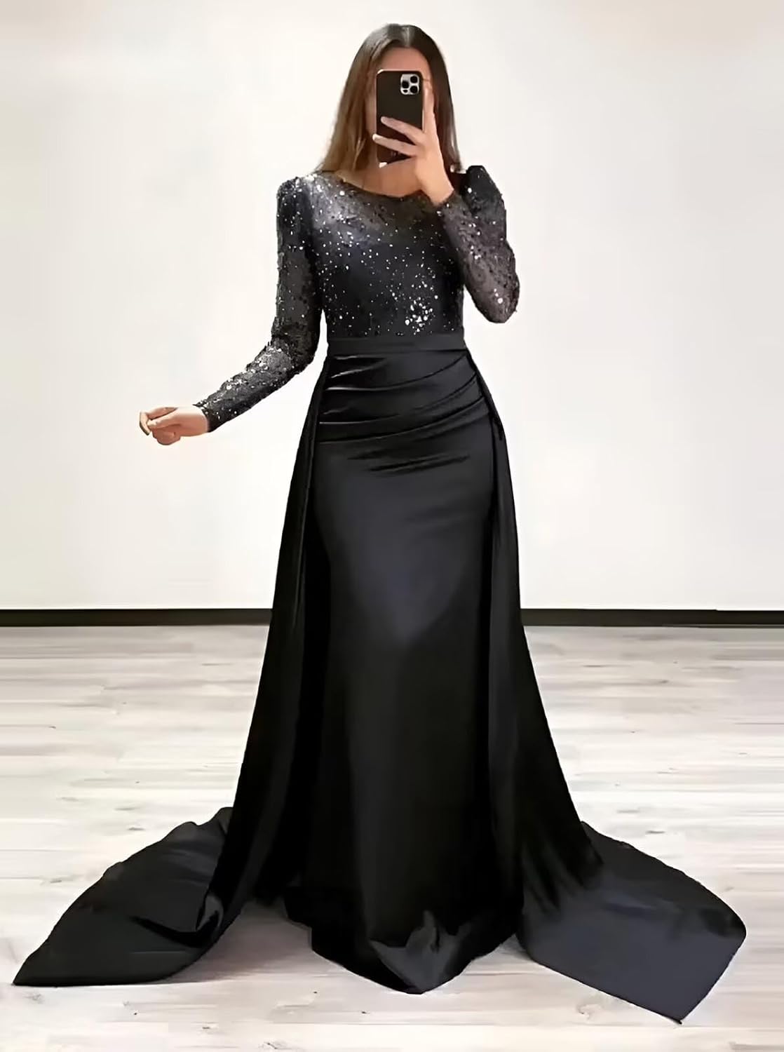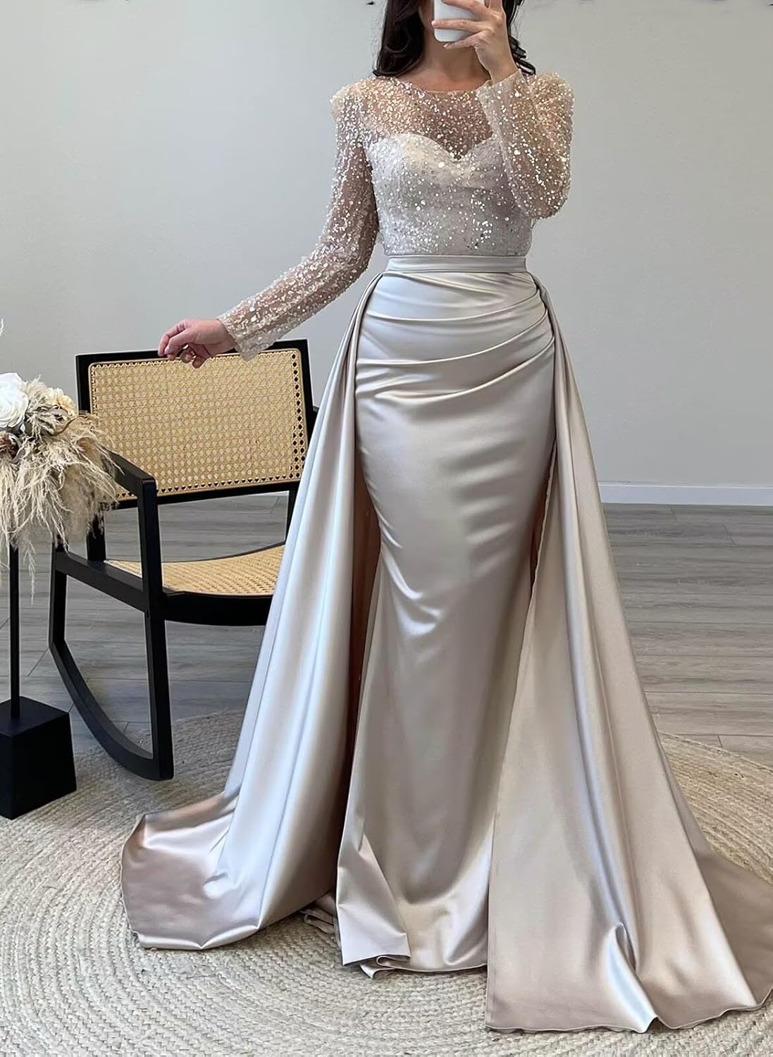 The video showcases the product in use.The video guides you through product setup.The video compares multiple products.The video shows the product being unpacked. long sleeve sequin satin mermaid prom dress long Merchant Video