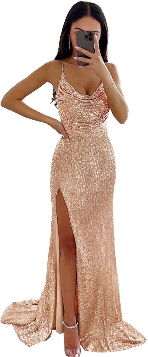 Mermaid Prom Dresss Long 2024 With Slit Cowl Neck Pleated Spaghetti Straps Sparkly Sequins Formal Evening Gown
