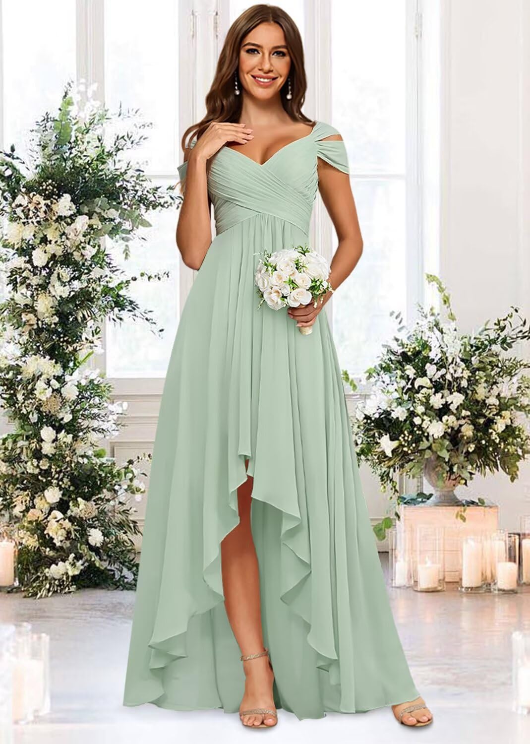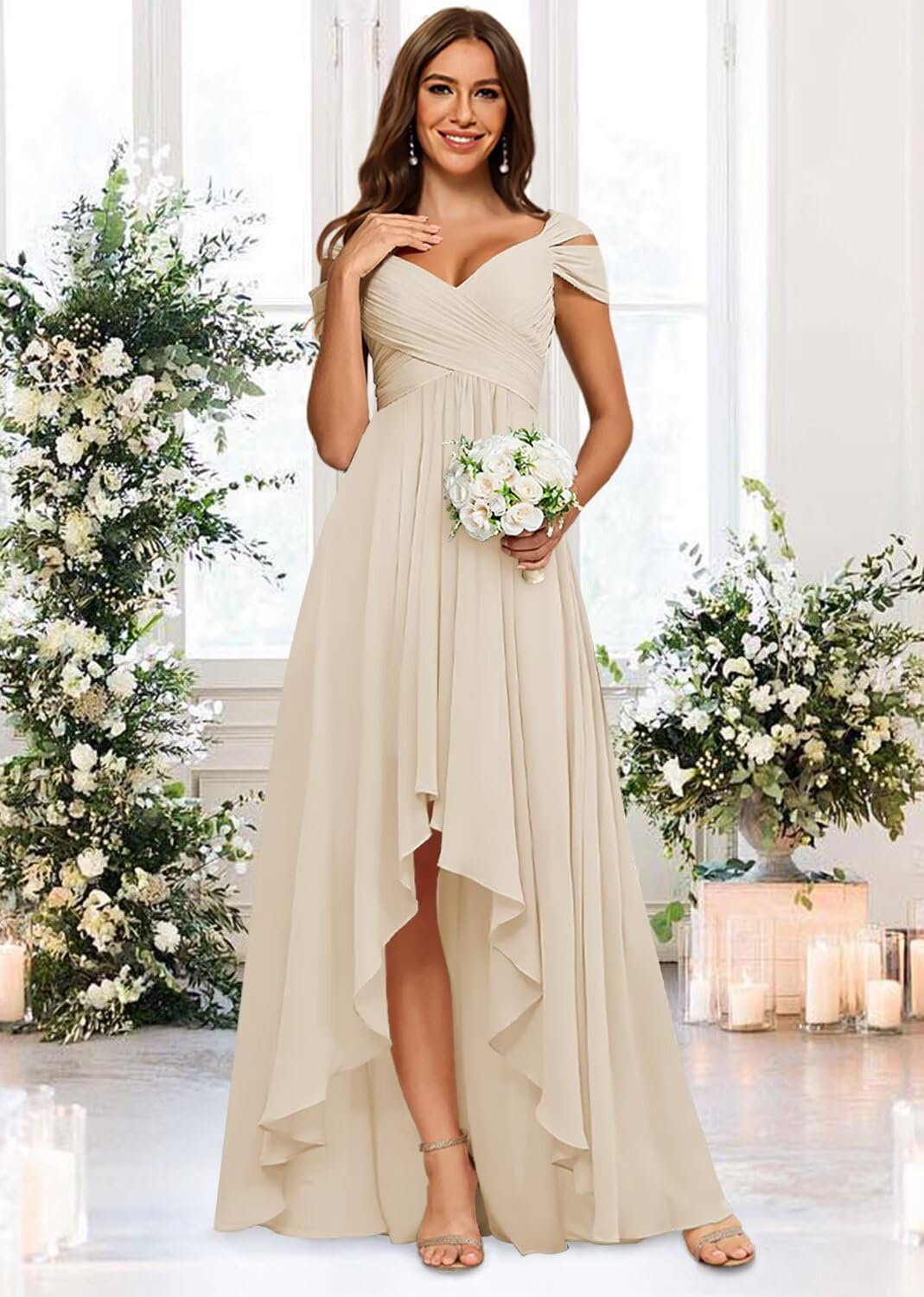 Review: Absolutely gorgeous bridesmaid gown. The chiffon flows beautifully and the off-shoulder design felt romantic. Received many compliments. Felt elegant and comfortable all night.