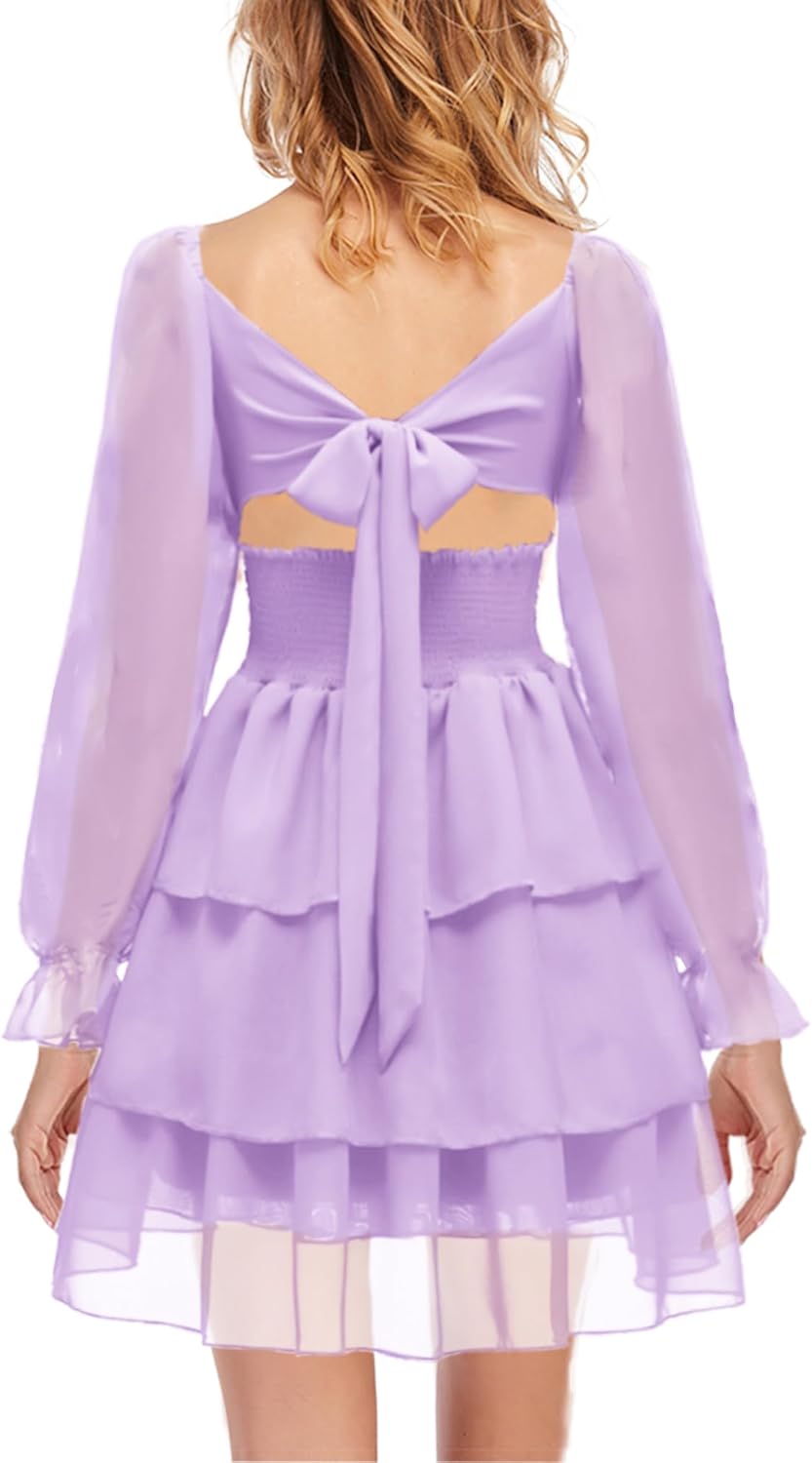 Tie Back Square Neck Aline Long Sleeve Layered Swing Mini Dresses