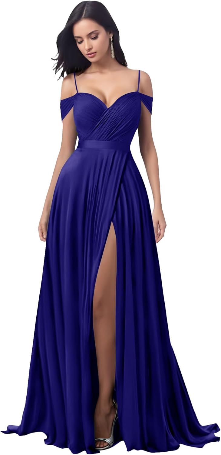 Off Shoulder Satin Prom Dress Long 2024 with Slit A-Line
