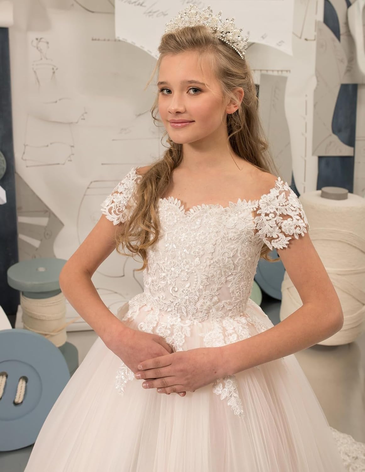 Off Shoulder Flower Girl Dress Lace Applique Tulle Pageant Dress Princess Kids