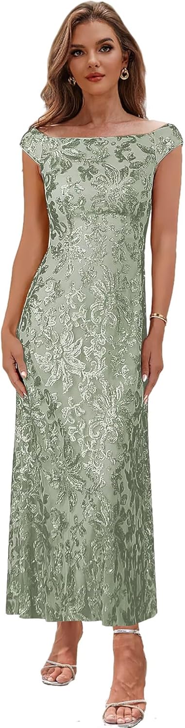 Off the Shoulder Mother of the Bride Dresses for Women Tea Length Formal Dress with Sleeves Sequin Lace Evening Gown