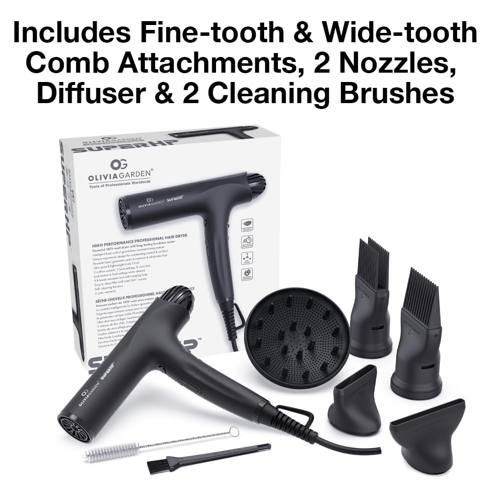 Review: This review is for Olivia Garden SuperHP Professional Hair Dryer, Black – High Performance, Long-Lasting Brushless MotorI’m very pleased with the quality and design of this hair dryer. The first thing I noticed is the slim and lightweight design of the unit. It’s wonderful to have a lightweight dryer for longer hair. It doesn’t fatigue your hand and arm to get your style just right. The dryer is also quieter than most. It comes with a long power cord that enables you to move around easily.The controls of the dryer are very easy to learn and operate. It has three blower levels and three temperature levels in addition to a cool shot option. The buttons are easy to use and you can operate them without even looking once you get used to their location and touch. There’s a great option to lock in a setting to prevent accidentally changing it while handling the dryer.This set has several styling tools. There are four styling nozzles from straightening to diffusing, these all worked well for me. I particularly like this dryer for the diffuse drying. I have fine, wavy hair that looks great when I have the time to let it air dry. When I need a quicker drying time, most other dryer’s diffusers are too hot or windy to get it right. This dryer give you so much control over air volume and heat that it dries my hair with the diffuser perfectly. I love it. The dryer dries quickly without creating frizz leaving my hair smooth and looking professionally styled.The dryer has a good system for easy filter cleaning with the included small cleaning brush. This dryer has been well thought out, and it has exceeded my expectations in quality and performance. I highly recommend this hair dryer.