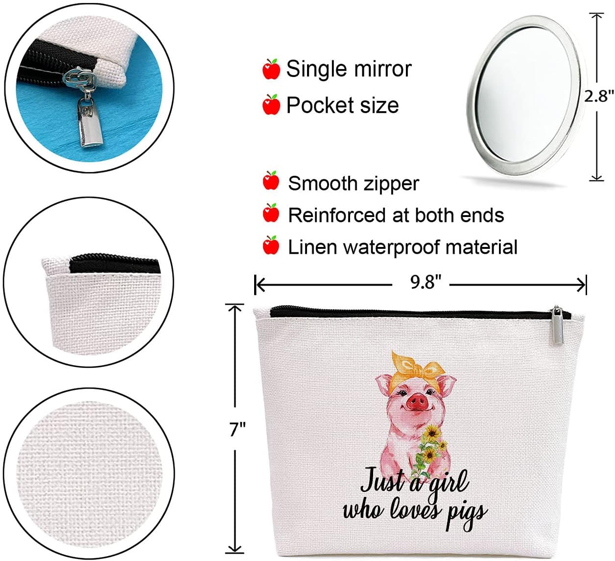 Review: I love this makeup bag. I love pigs and the design is very cute. The picture of the pig is on both sides and the bag is larger than I expected so that was a nice surprise. The mirror is very cute also and I have it in a smaller bag in my purse. Very pleased with purchase and would recommend if you love pigs like I do.