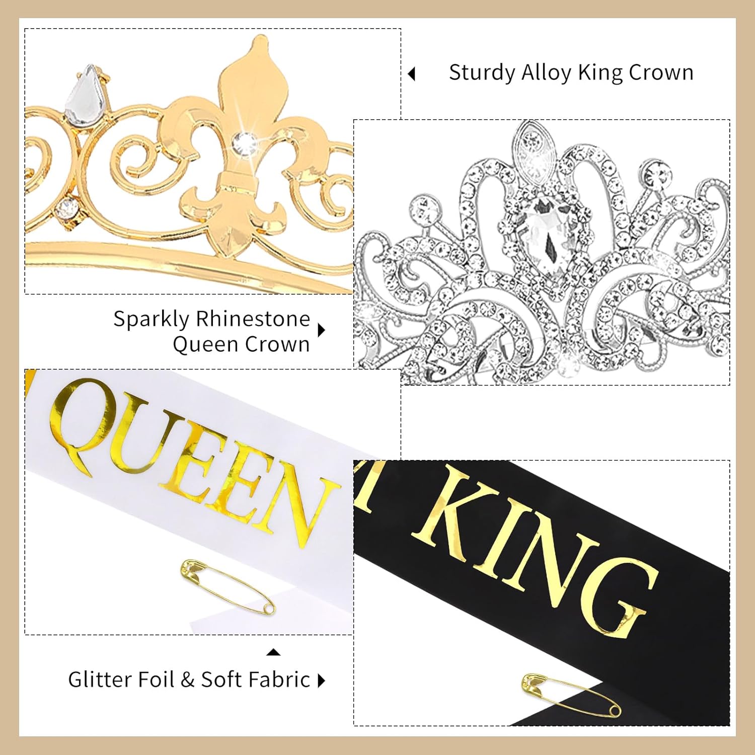 Review: Feel like royalty. Never got the chance to be on the Court in High School, let alone be the Queen or King. This is your chance. Solid, full metal crown has a bit of weight to it. Has four rings on the inside for hair pins to help secure it, if needed. The crown looks just like the pictures, gold rhinestone embellishments, giving it a nice overall look without being to sparkly. The tiara is fully embellished and it is very sparkly. Also a gold metal color but the rhinestones are the star of the show. This tiara is a bit on the small side, the metal is flexy but it seems like it would fit around an updo or at least be more comfortable. Just two metal hair clips to help secure in place. Sashes are easy to read and also sparkly. Adult Prom is not ready for us this year….Nice quality costume pieces, seem better than what we would have won back in the day.