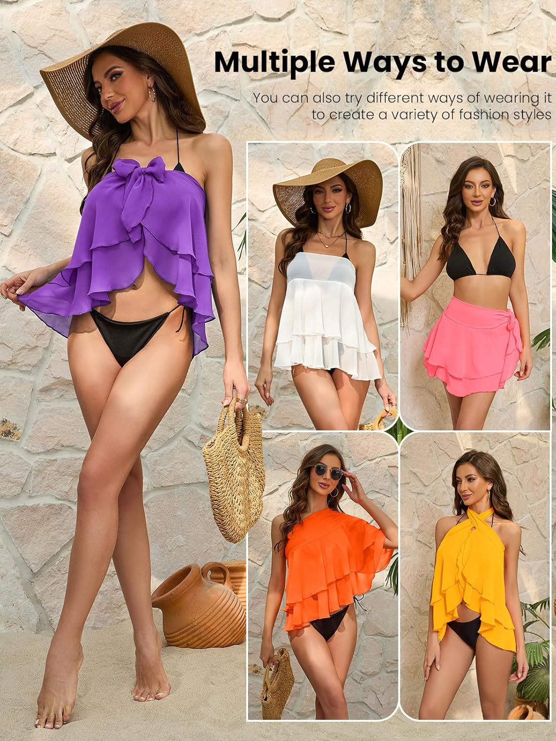 Review: Yeah, this one was a definite fail for me. Looked great on the model, but I guess I should’ve noticed that almost all the ways they show you wearing it leave your stomach and hips totally out there. Kinda defeats the purpose of a coverup for most people since, you know, we’re trying to cover those areas, not show them off like a model. It’s telling that no other reviewer has posted photos of those styles. I’d hoped the dress or skirt styles might redeem this product for me, especially considering other reviewers have positive things to say…but, I just can’t agree with them. This looked so shockingly bad on me that I’m actually too embarrassed to share my photos. The fabric is so uncomfortable and unflattering. It’s just thin, 100% sheer mesh and full of static – nothing like the thicker, silkier material in the advertised photos. Tbh the “skirt” looked like I’d just wrapped some tulle around my waist with a bulbous, bad knot. As a “dress,” well…no shocker, I’d pulled an unsightly skirt up my body as if some miracle would happen once it was up there. I can’t recommend this product.