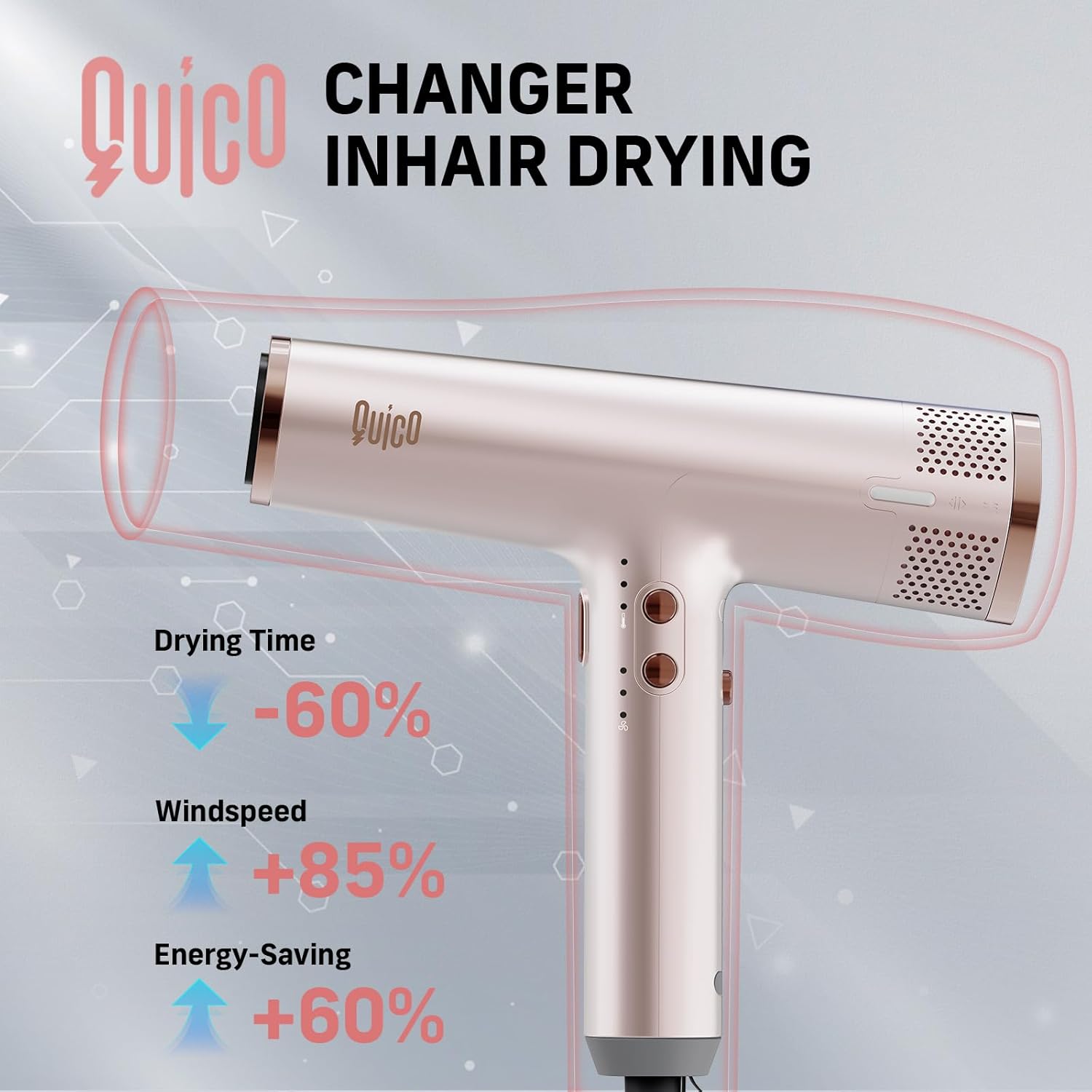 【3 Level Speed, 3 Level Heat & Ultra-Quiet】Buy Quico powerful blow dryer Enjoy total control with 9 different combinations of 3 temperature(cool air) and 3 wind speeds for various hairstyling. At just 58dB, our high-speed hair drys low-noise technology makes it perfect for everyone, including families with babies and pregnant women.