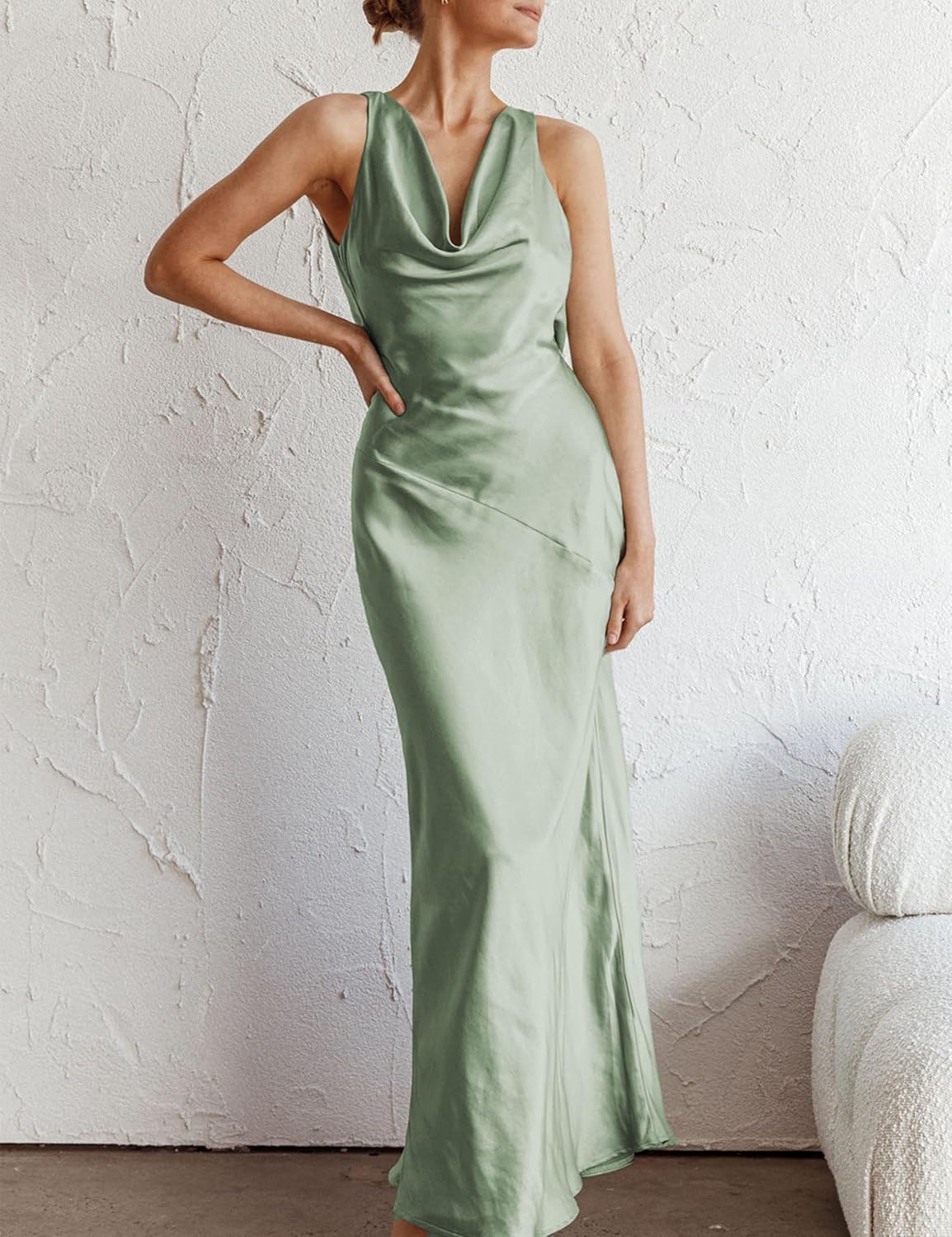 Women’s Cowl Neck Sleeveless Satin Open Back Cocktail Wedding Party Maxi Dress