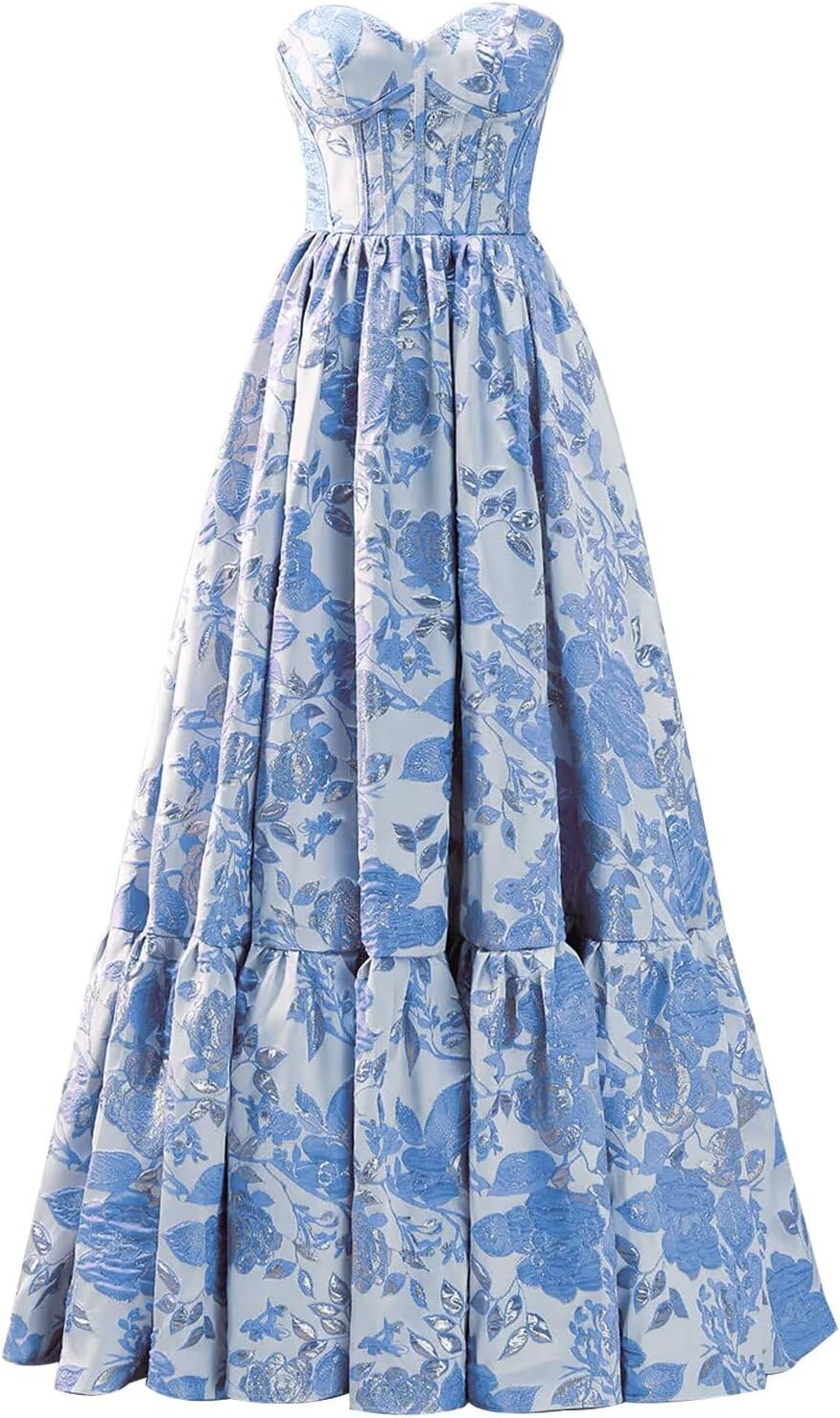 Satin Floral Jacquard Prom Dress with Corset and Pockets – Strapless Evening Gown