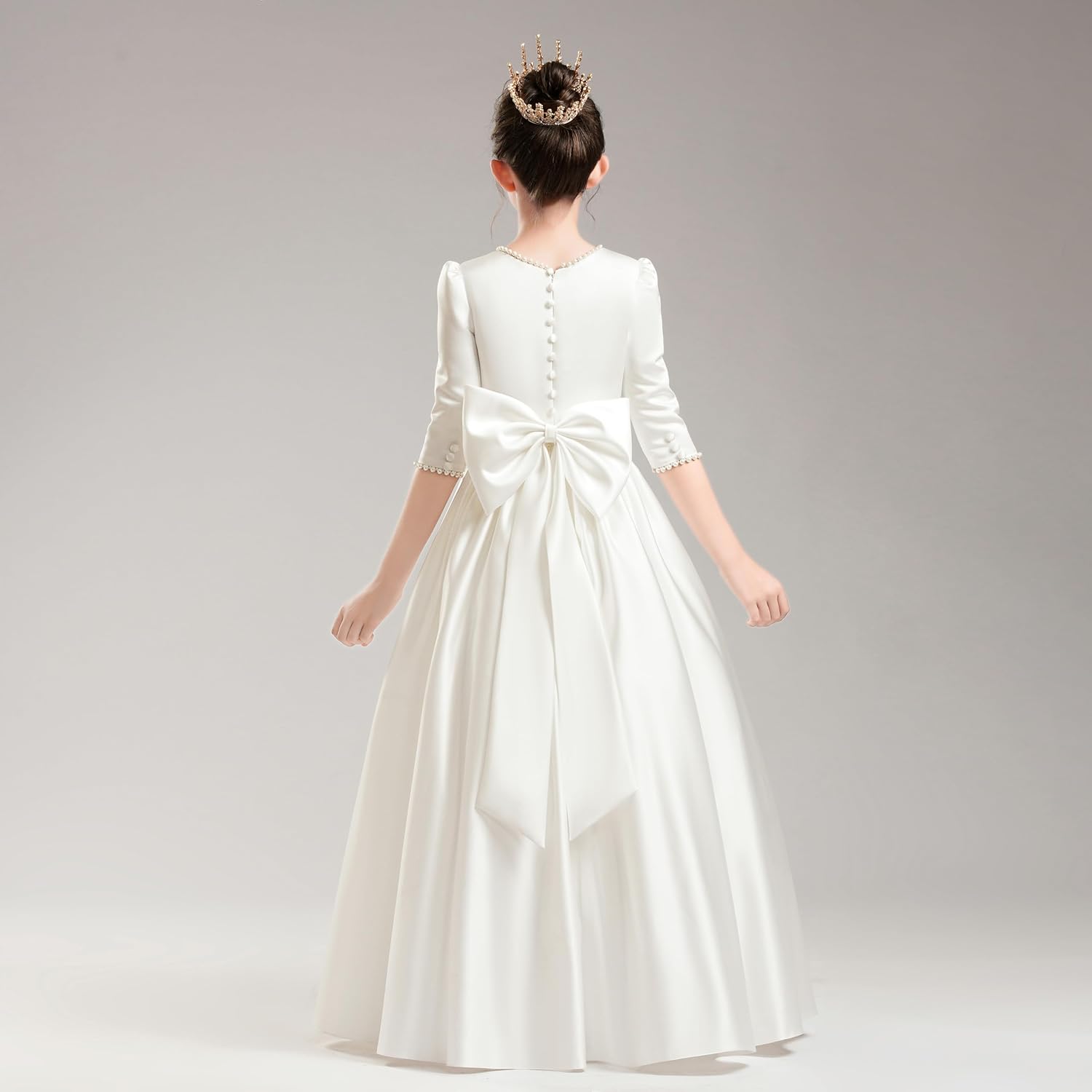 Review: Dress is beautiful and appears to be well made! Ivory color is perfect. Bow attaches separately if not wanted. It is fully lined and a built in crinoline gives it some volume. My 8 yr daughter measured a size 6 and it fits very her well on the chest and waist. Hemline hit at just above her ankles, which seems to be an inch or so shorter than the measurement on the chart. She did feel as though the shoulders and arms were too tight so we are going size up to an 8.